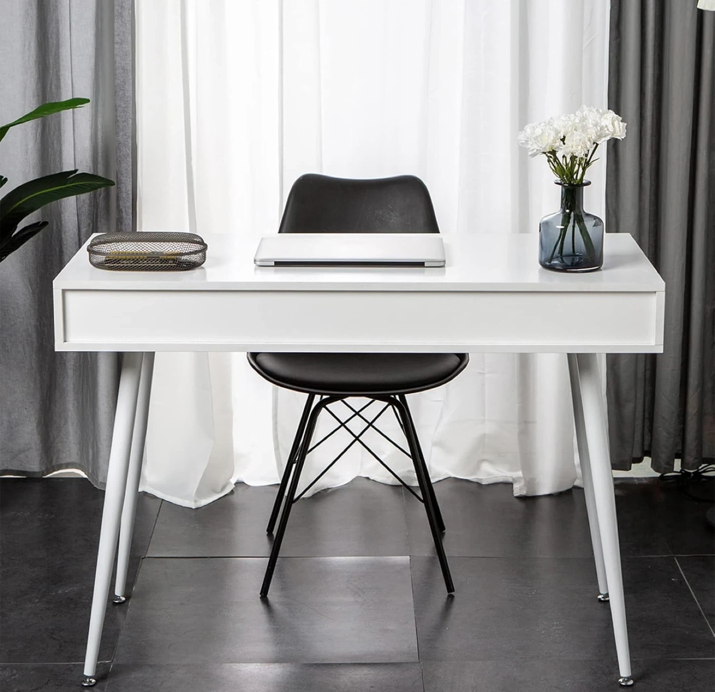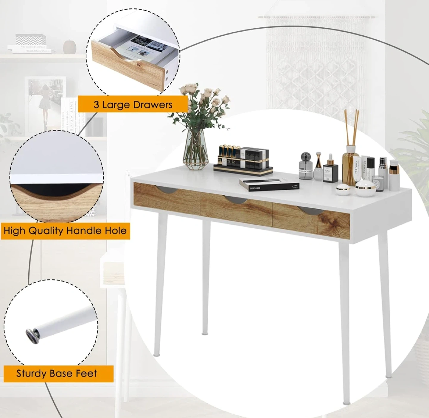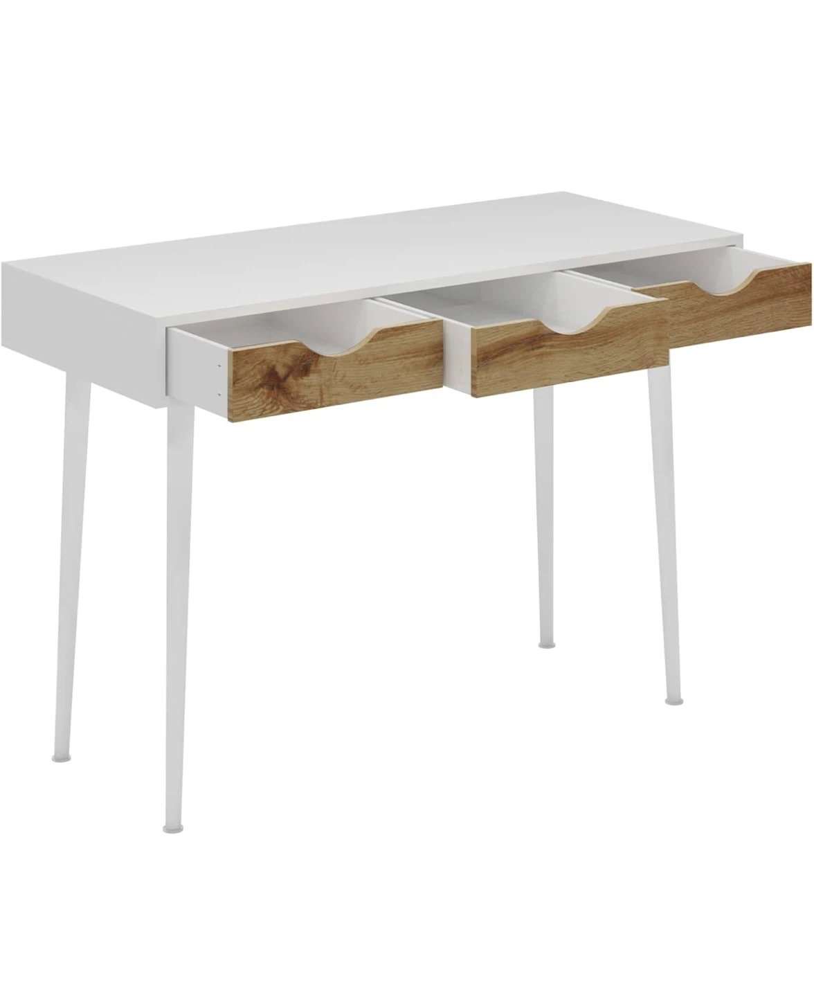 This desk features a clean white finish with three wood-grain drawer fronts. It has a sturdy base with adjustable feet. The overall dimensions are 110cm wide, 50cm deep, and 78.8cm high.
