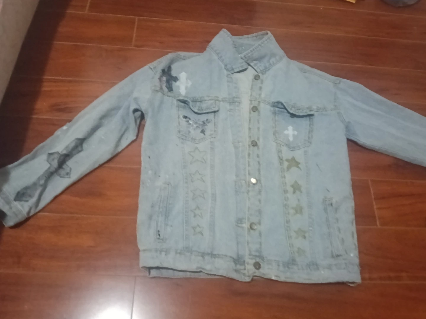 Selling a light blue denim jacket with a unique cross and star design. It's a cool piece to add to your wardrobe for a bit of edge. The jacket features designs on both the front and back, making it stand out!