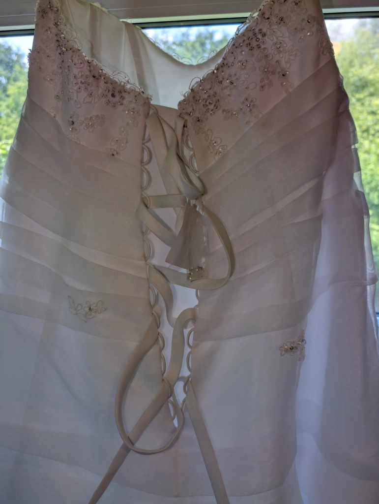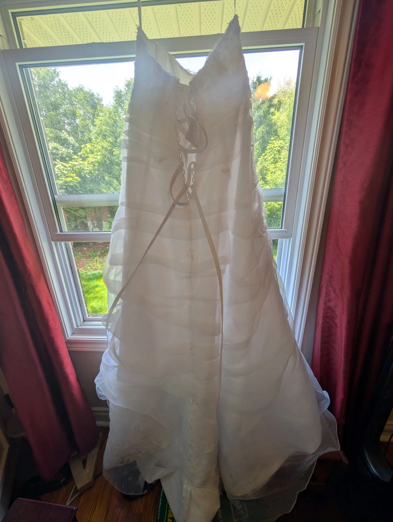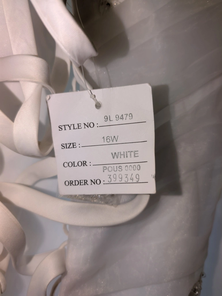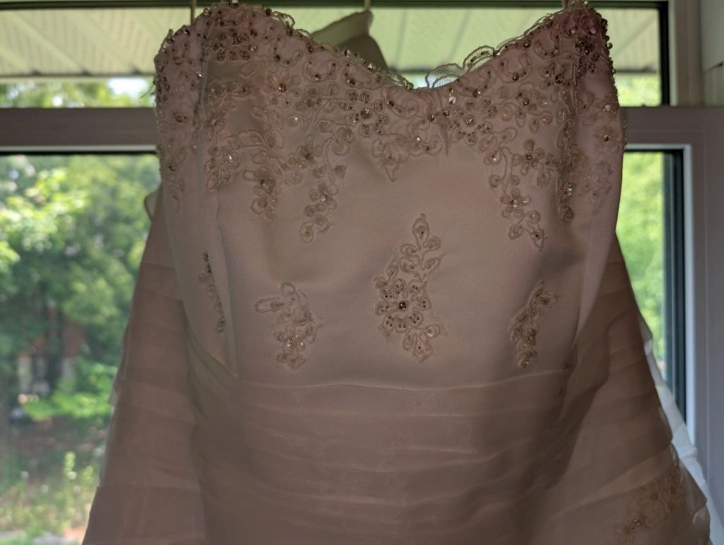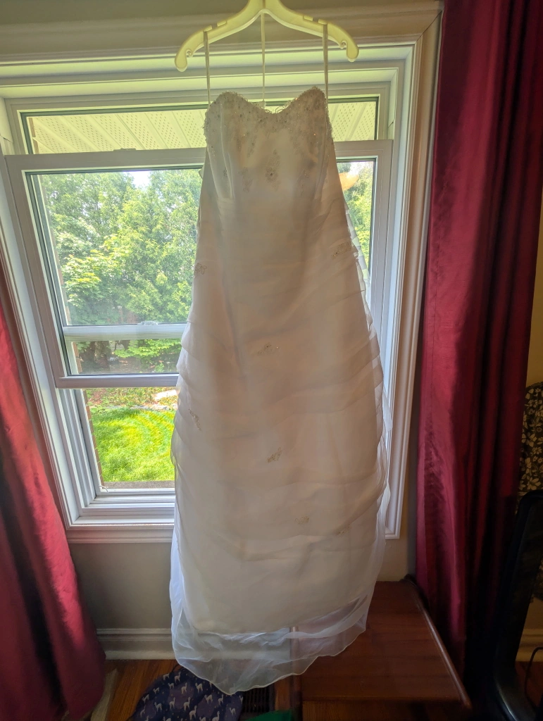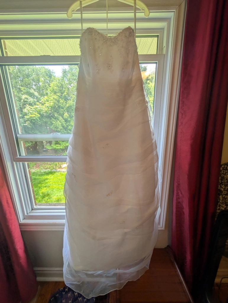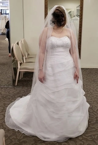 Selling a lovely white wedding dress in size 16W. Never been worn or altered. Bought off the rack from David's Bridal. Has been kept in a garment bag, but also from a cat-friendly household. Pick up only please, veil NOT included(sorry).