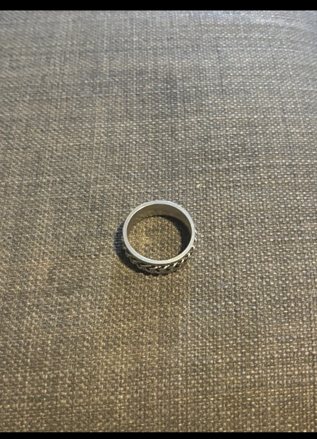 Selling a silver ring with a braided pattern. It's good condition available anytime Size 11 no measurements after that