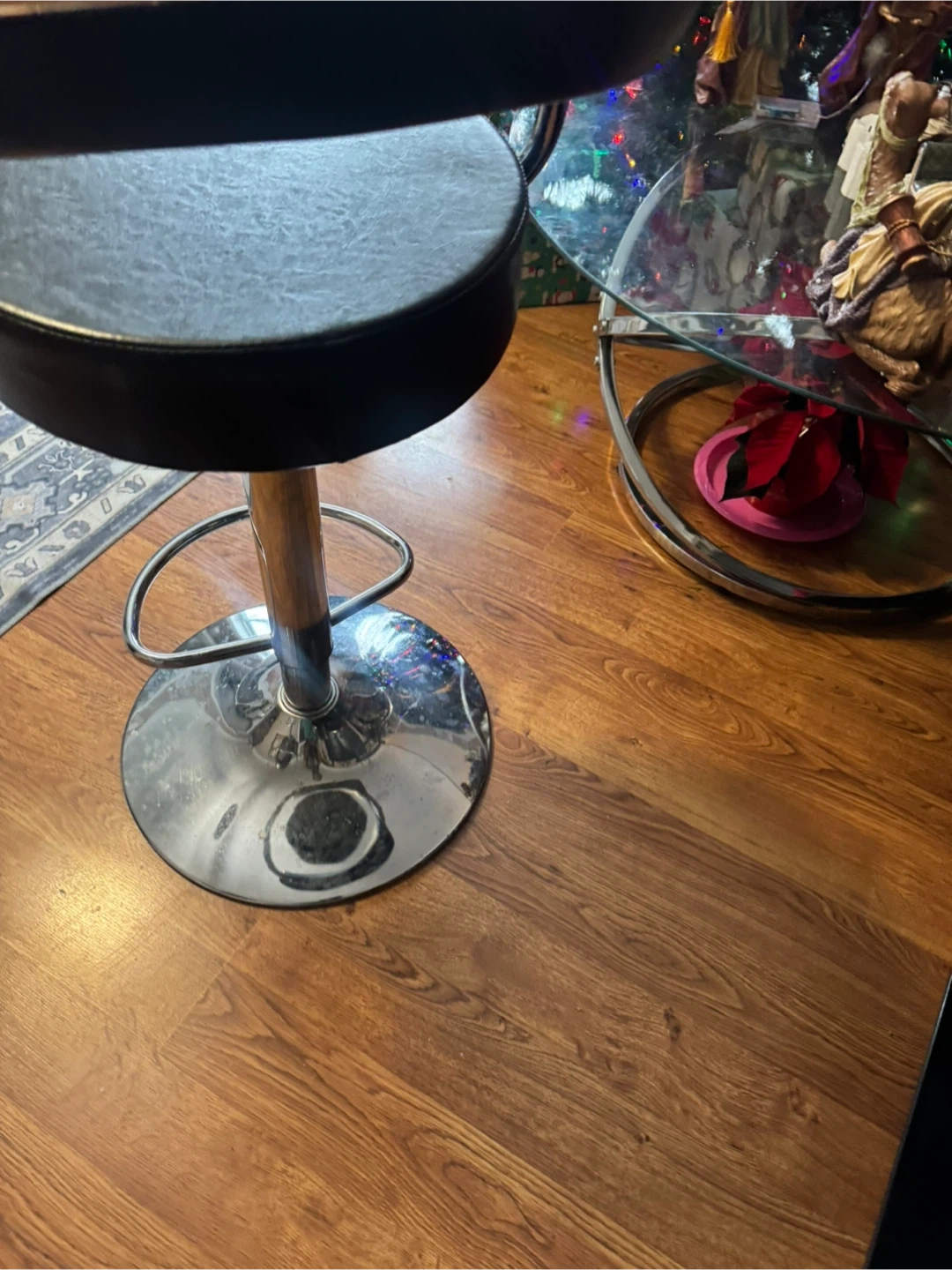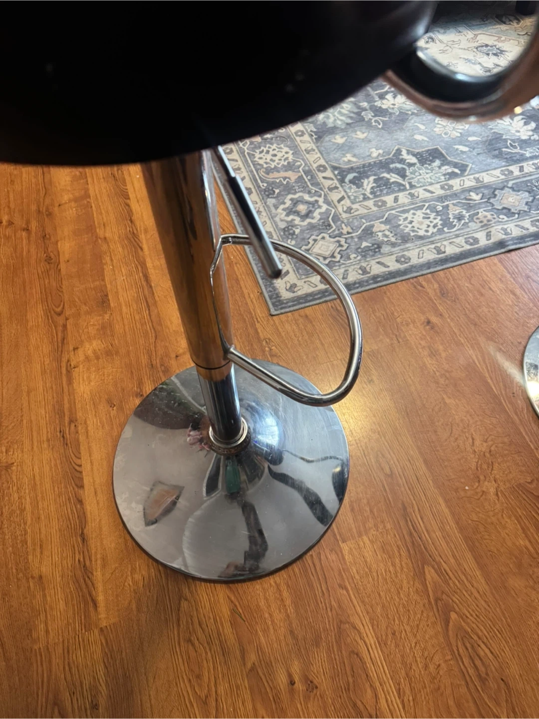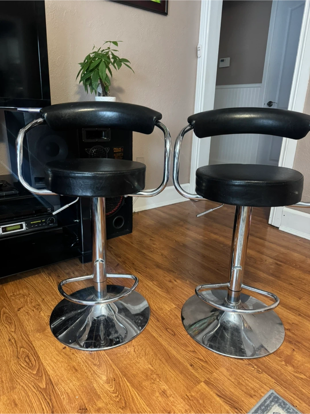 Selling a pair of black bar stools. good condition and would look great in any kitchen or bar area. The stools have a chrome base and a comfortable seat. Get in touch if you're interested!