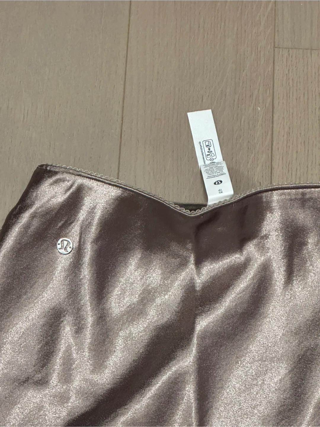 Never worn Lululemon gold satin midi skirt. Body: 100% Recycled Polyester. Lining: 100% Polyester. Size XS.