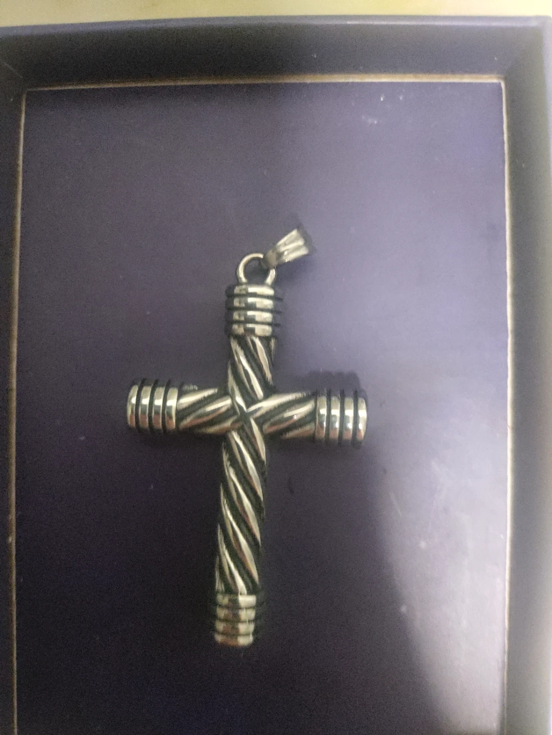 This cross pendant has a unique twisted rope design with ribbed accents on the ends. It's made of metal and has a silver-like finish. This piece would make a thoughtful gift or personal accessory.