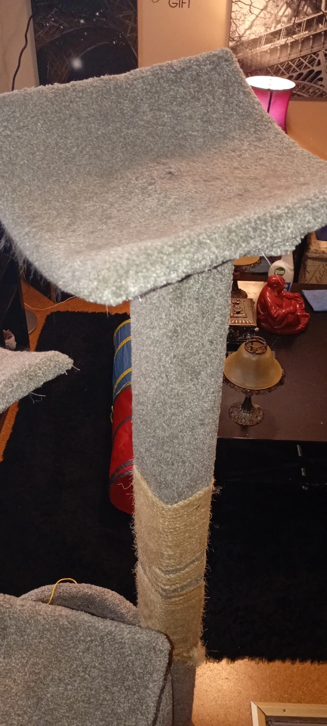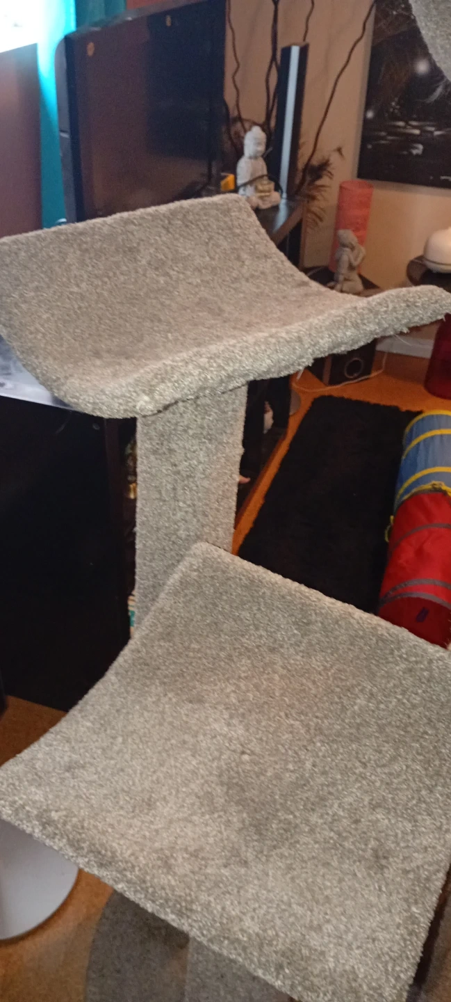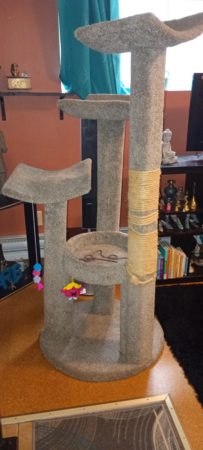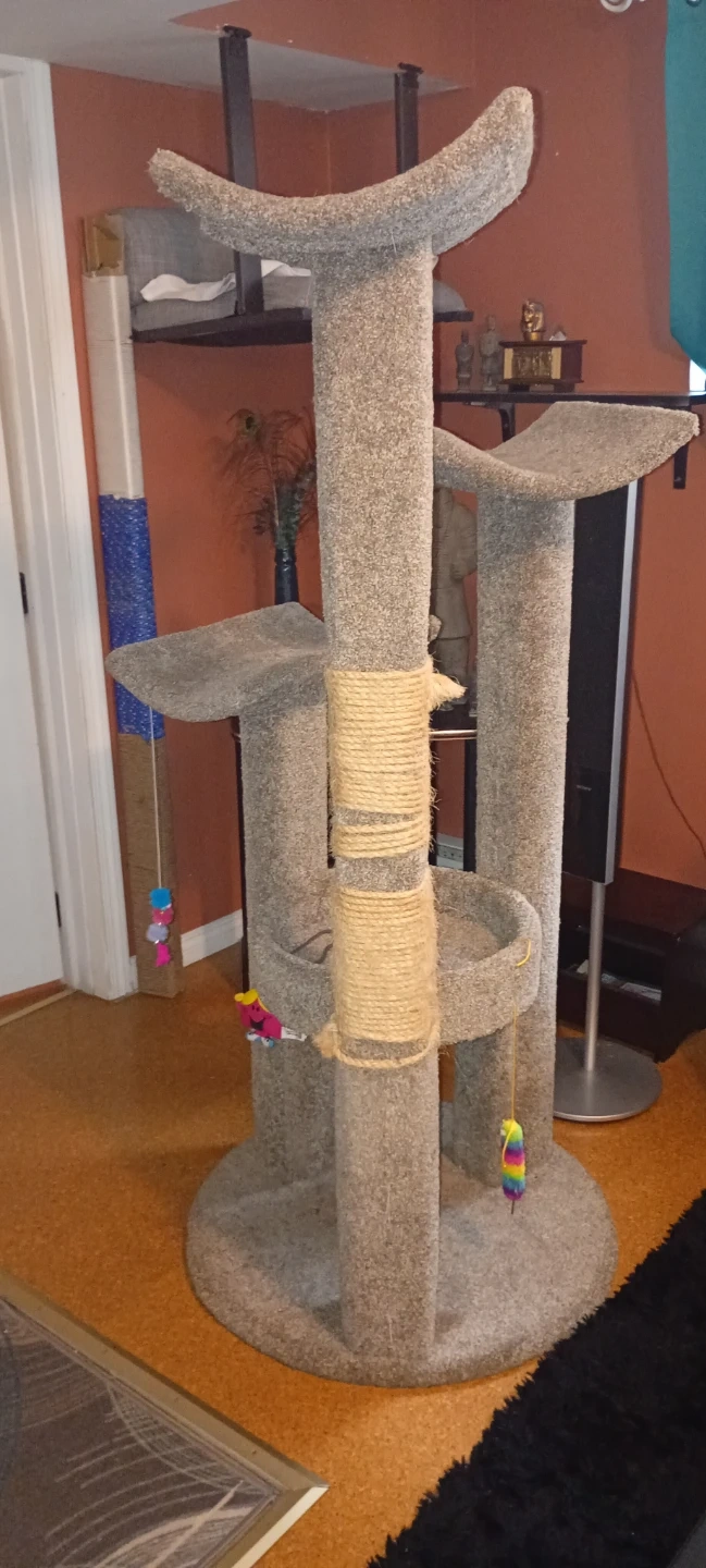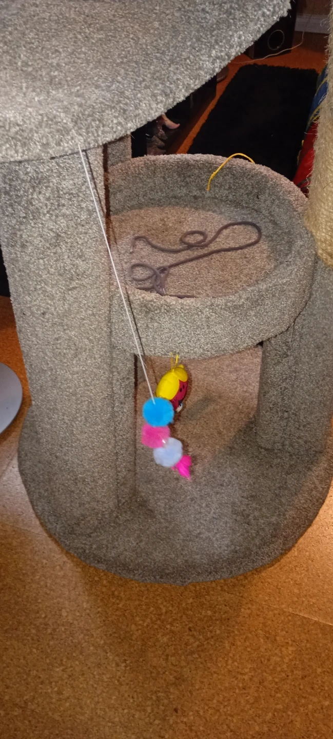 A multi-level cat tree condo with scratching posts wrapped in sisal rope. It features several platforms and a cozy hideaway for your feline friends. Includes hanging toys for added fun!