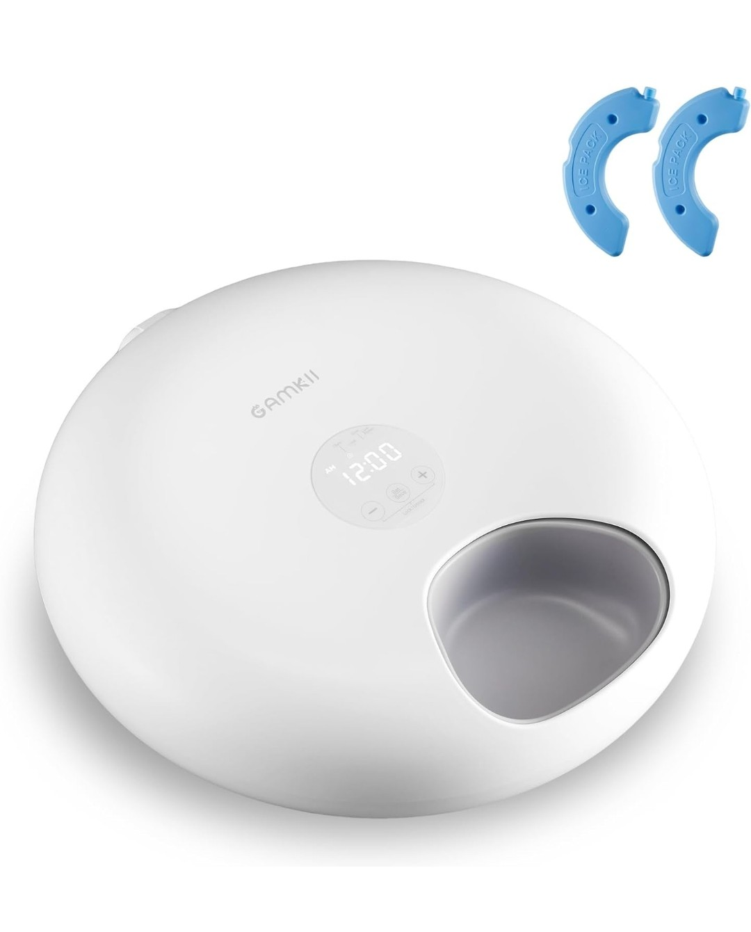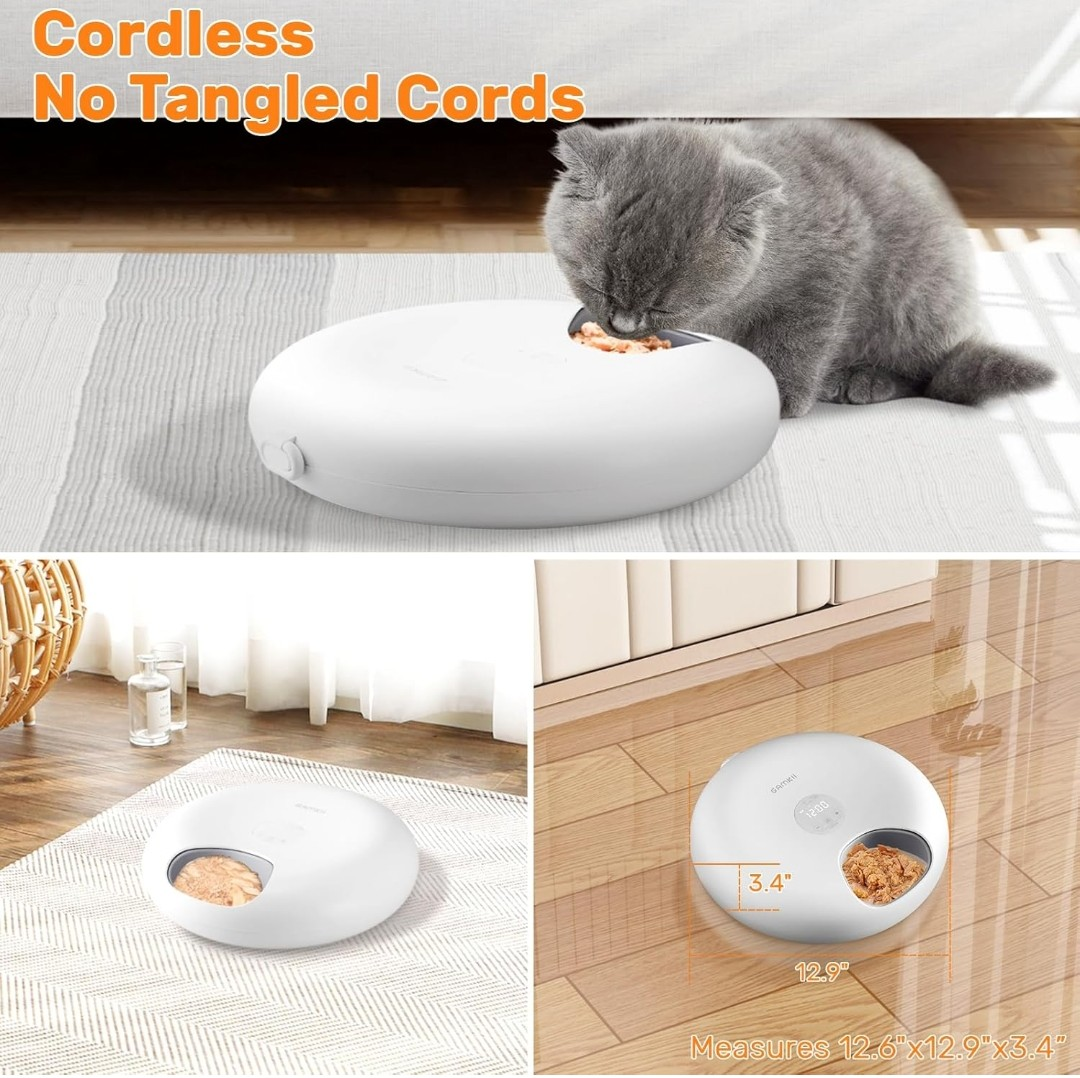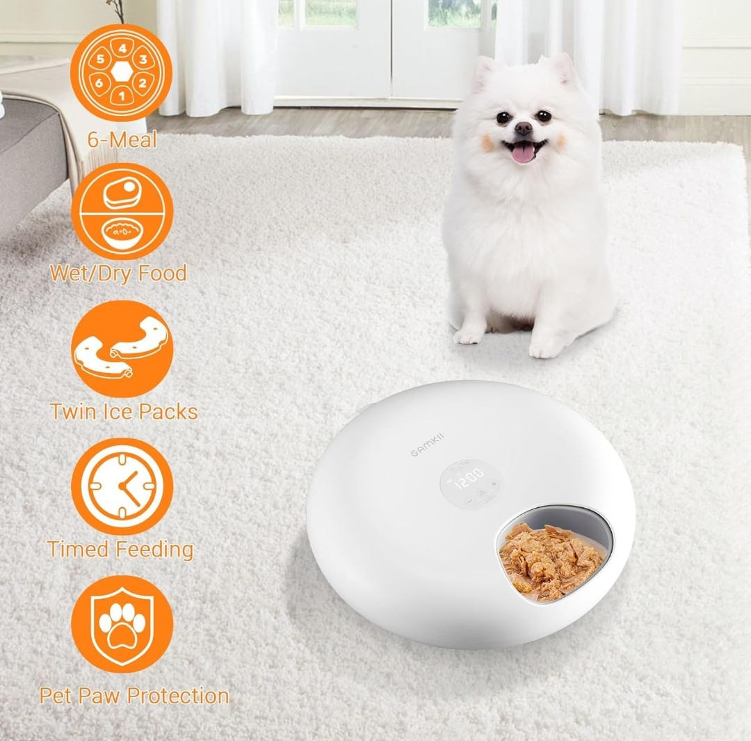 Selling a Gamkii automatic pet feeder! It's designed with a detachable food tray for easy cleaning. The feeder has a 3600mAh battery that lasts for 6-8 hours and provides up to 30 days of endurance time. It features 6 meal compartments and is suitable for both wet and dry food. Twin ice packs are included to keep the food fresh. The dimensions are 12.6" x 12.9" x 3.4".
