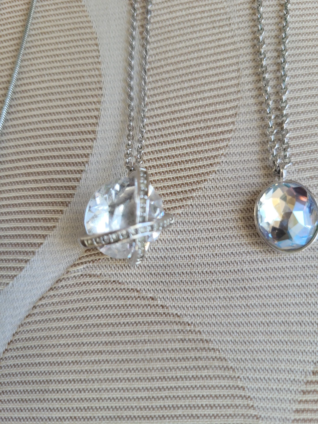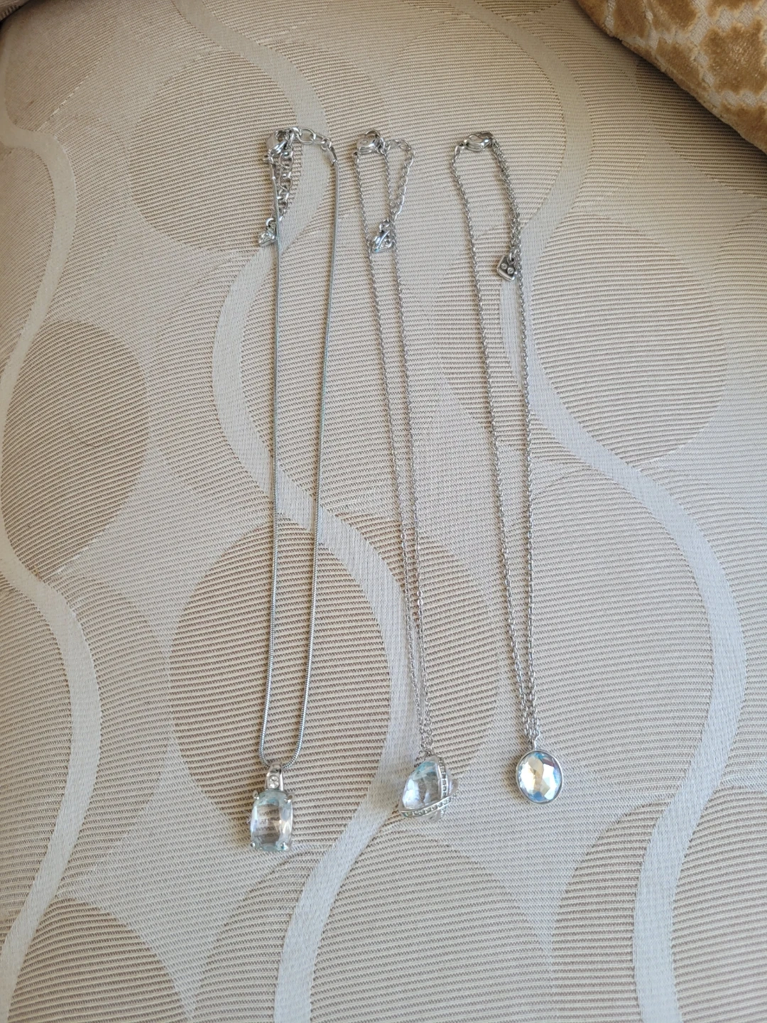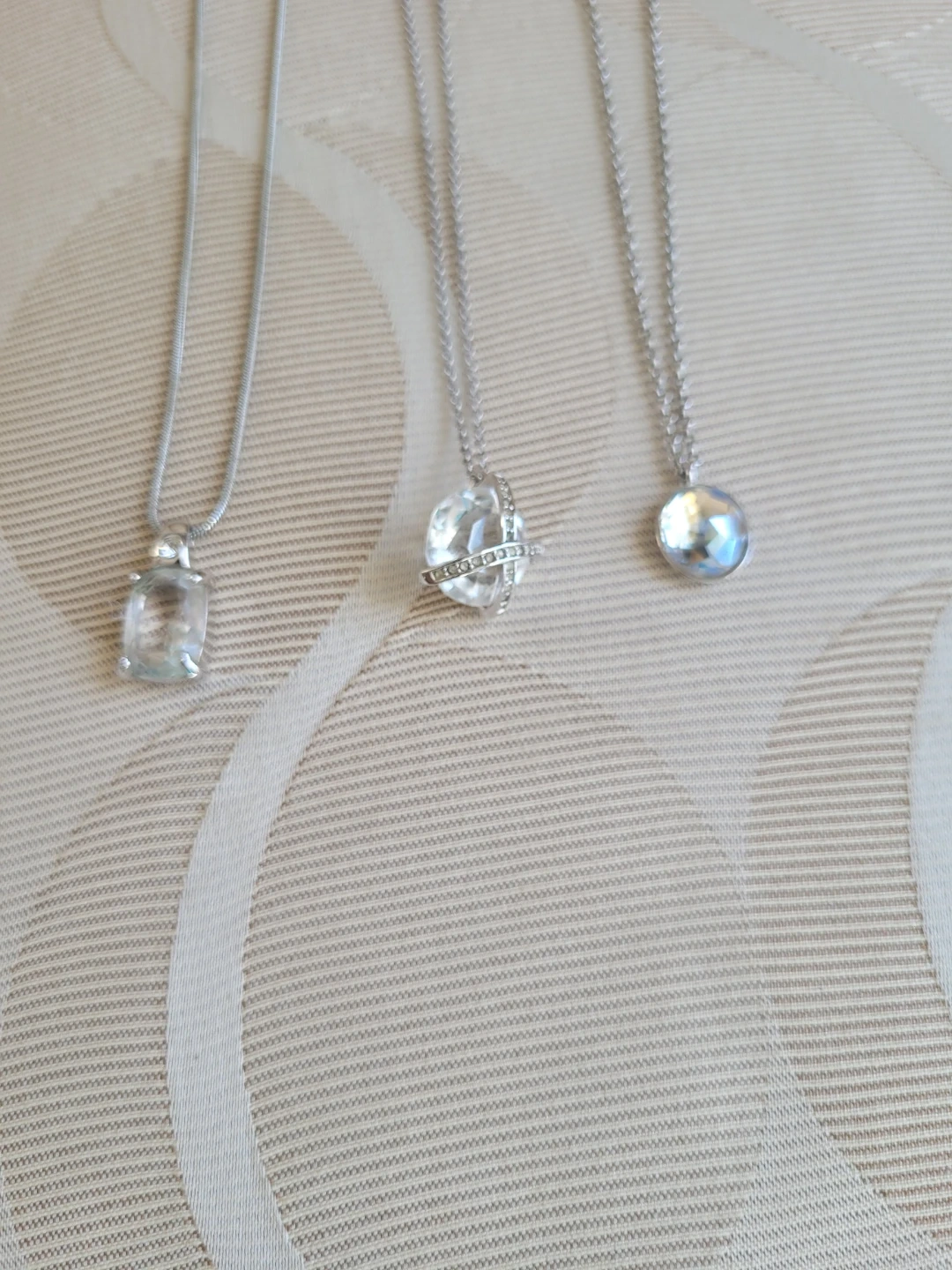 Three authentic Swarovski necklaces, each featuring a different pendant. One has a clear rectangular stone, another a round faceted crystal with a criss-cross design, (1 tiny crystal missing) and the third a smooth, iridescent circular stone. They all have trademark swan. They're perfect for adding a touch of sparkle to any outfit!