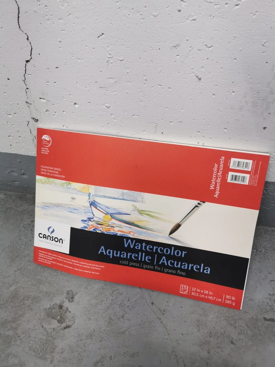 Selling a Canson Watercolor Aquarelle pad. It's cold press, with a fine grain. The pad is 12 in x 18 in or 30.5 cm x 45.7 cm and 90 lb/185 g