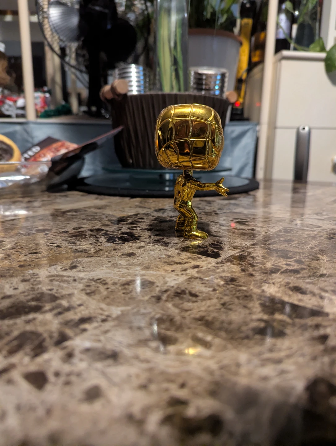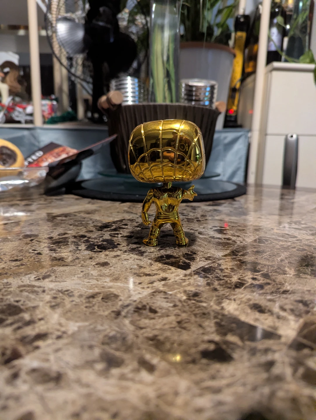 This is a Funko Pop! collectible figure of Spider-Man in a shiny gold finish. It's a great addition for any Marvel or Funko Pop! collector. Limited edition Funko, goes for $300+ with the box.