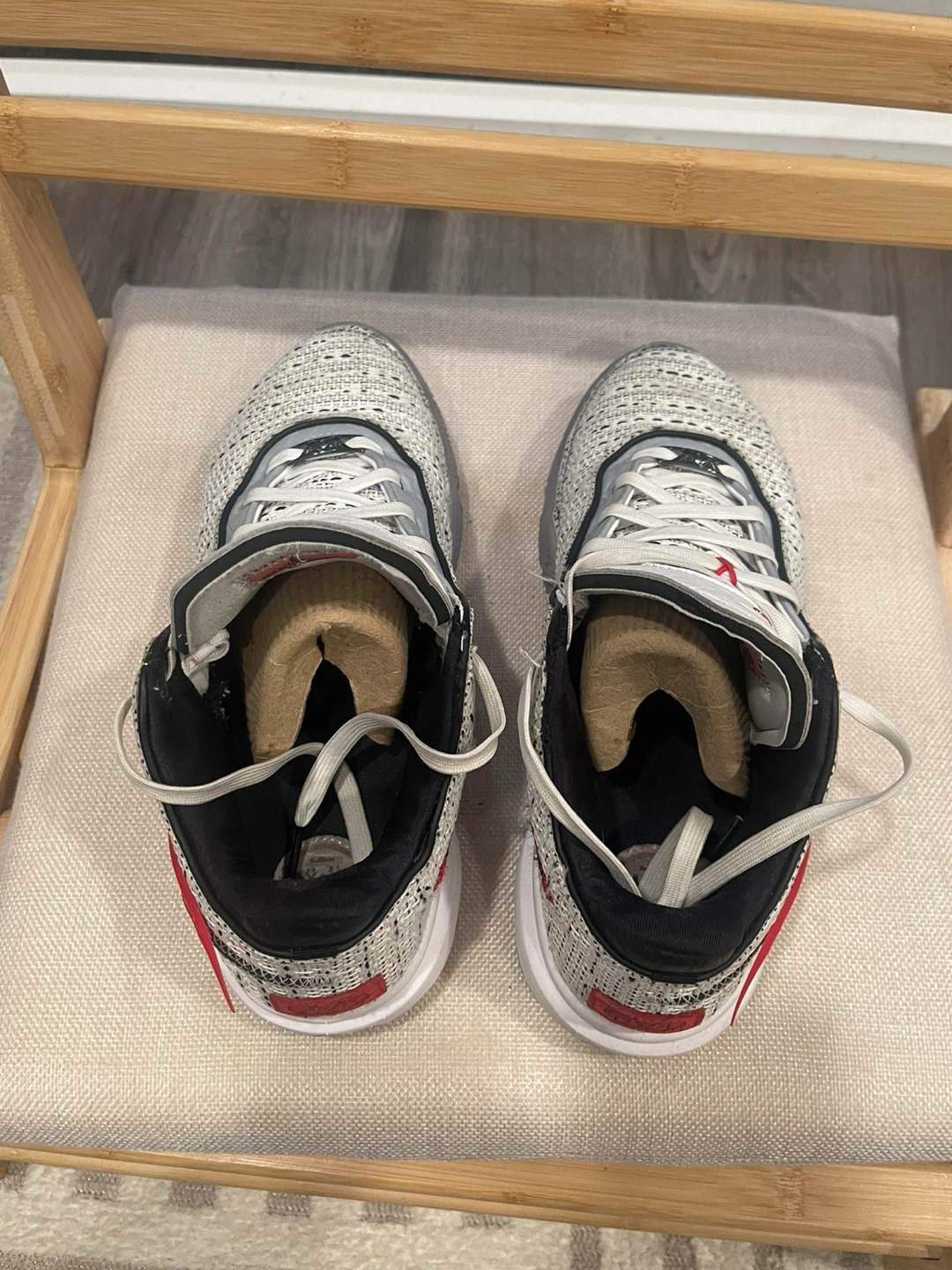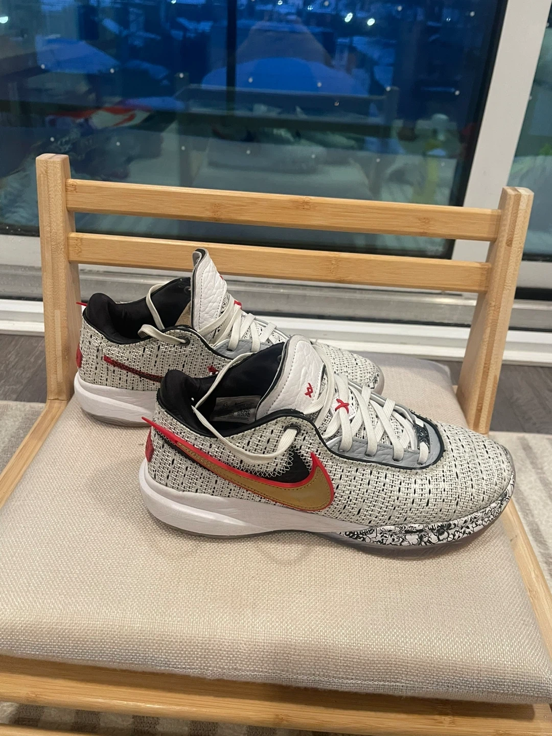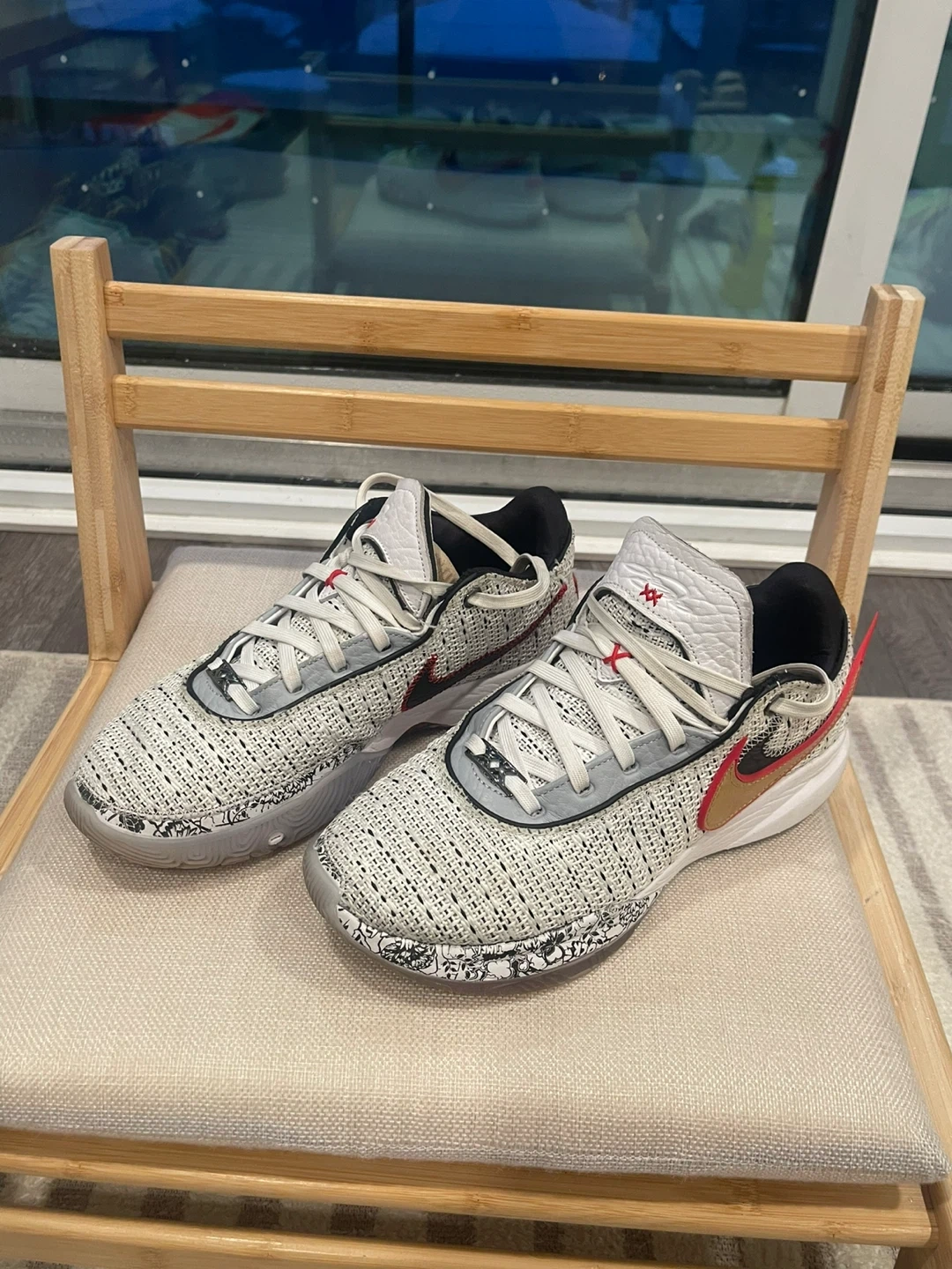These are Nike LeBron Witness 5 basketball shoes. They feature a white and black knit upper with red and gold accents. The soles are white rubber with a grey and black patterned trim.