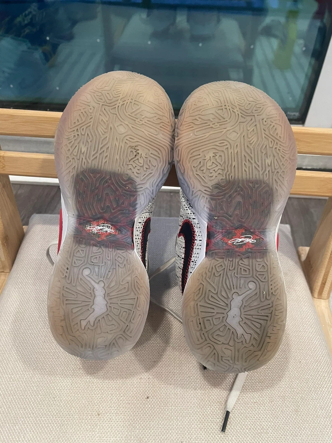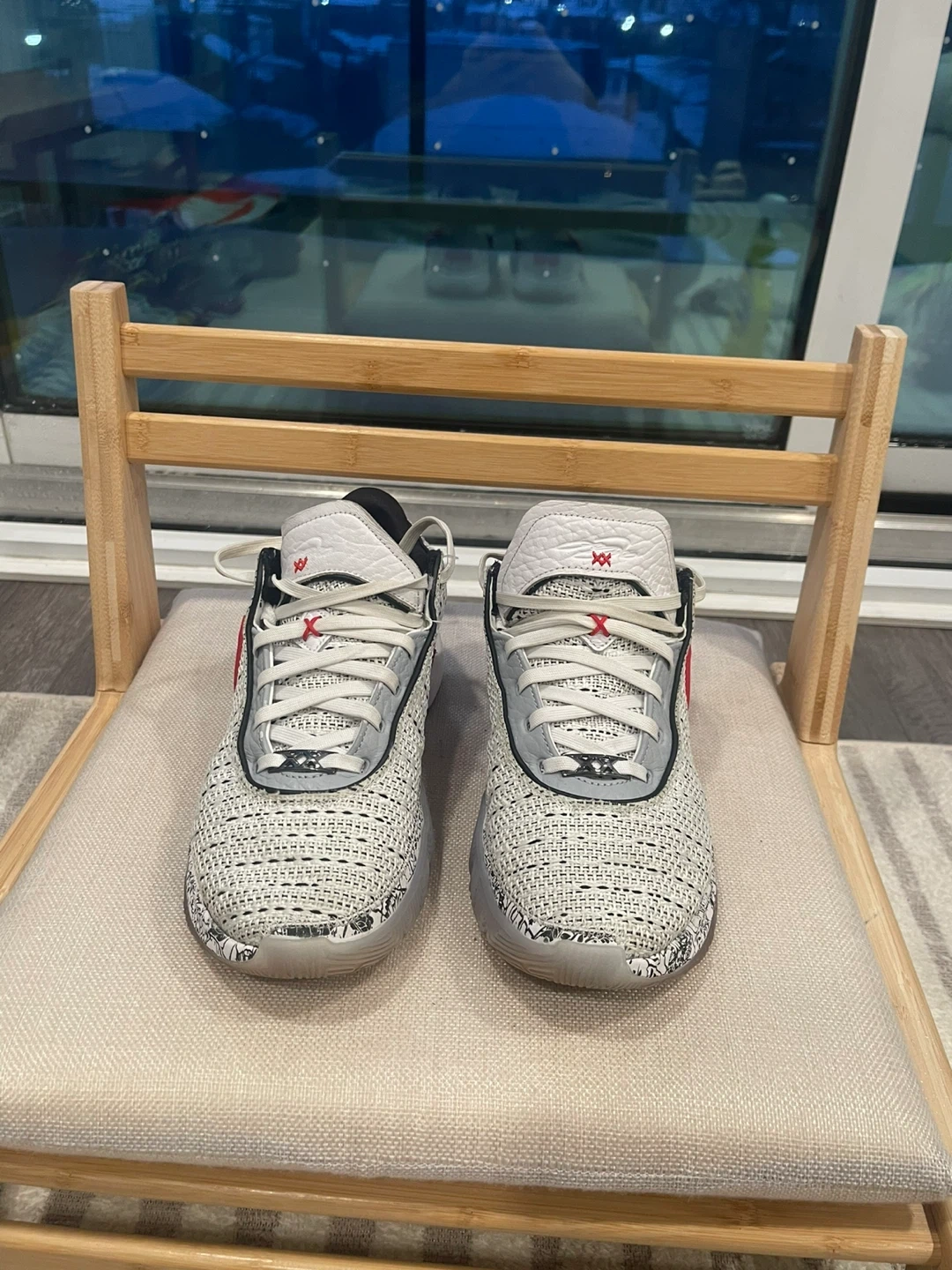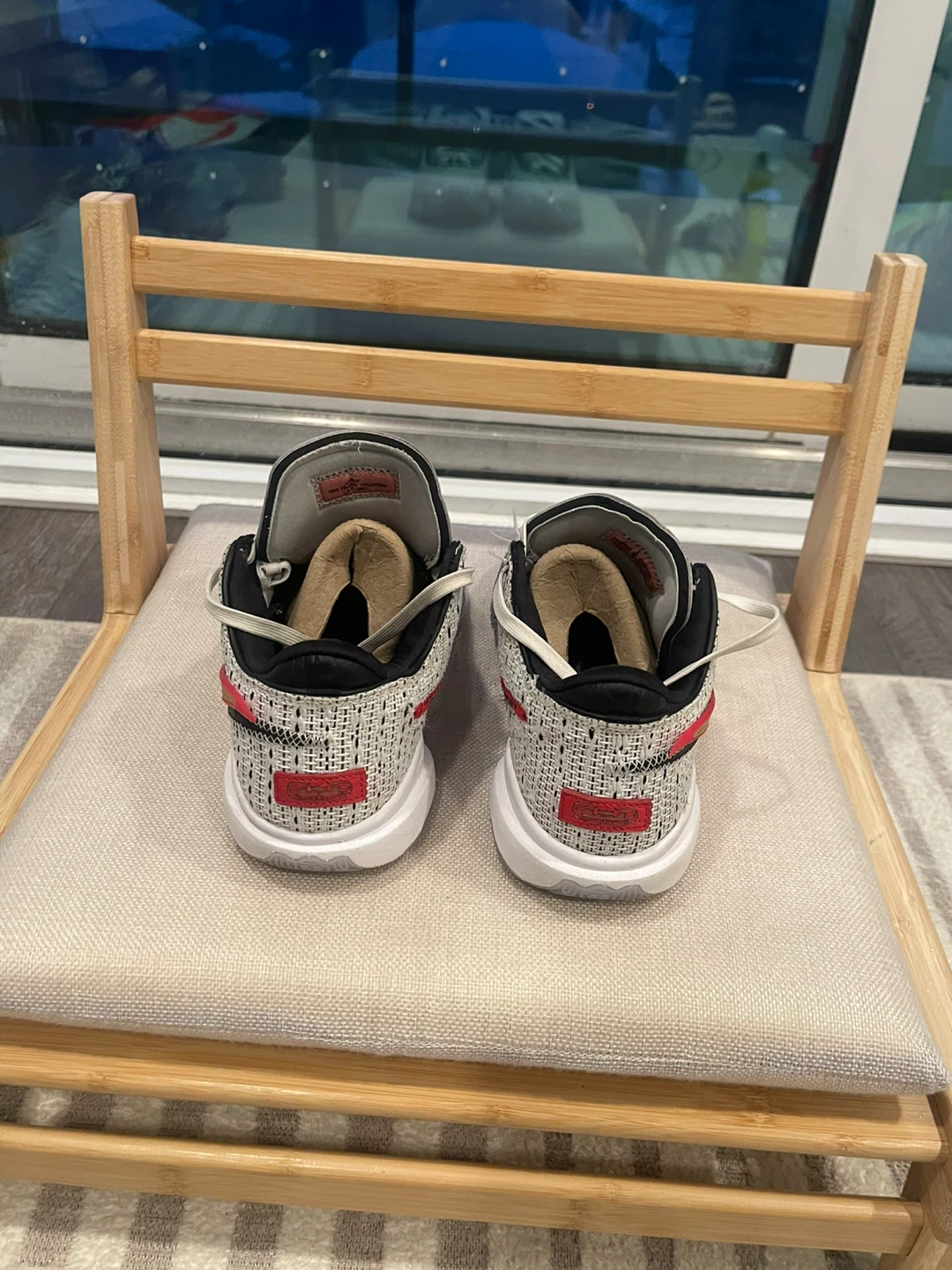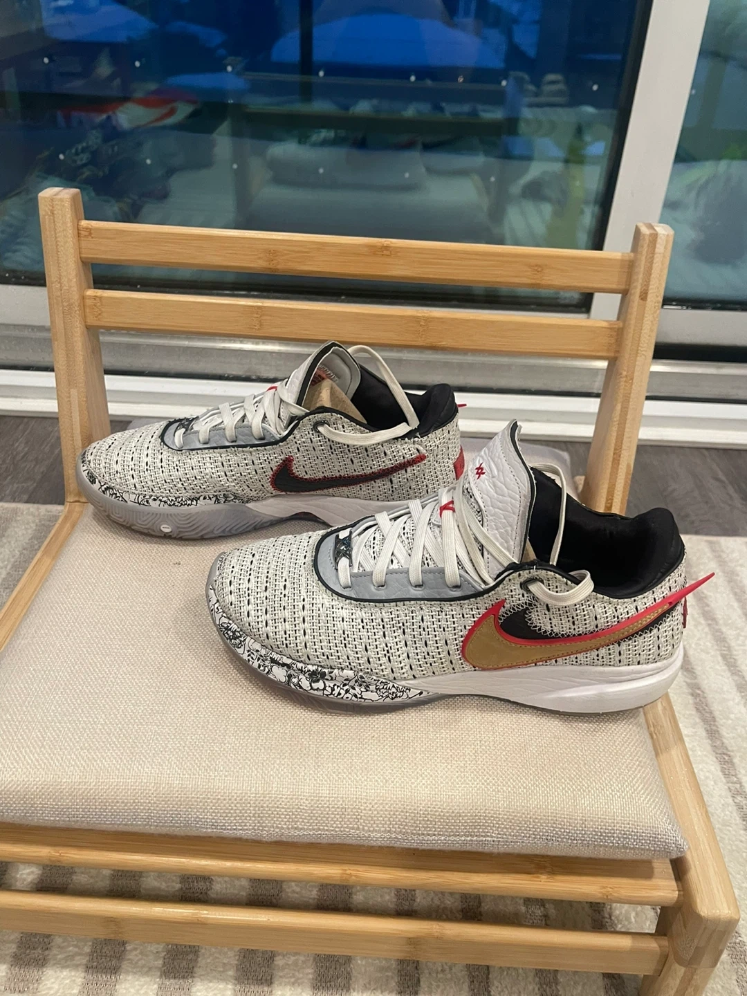 These are Nike LeBron Witness 5 basketball shoes. They feature a white and black knit upper with red and gold accents. The soles are white rubber with a grey and black patterned trim.