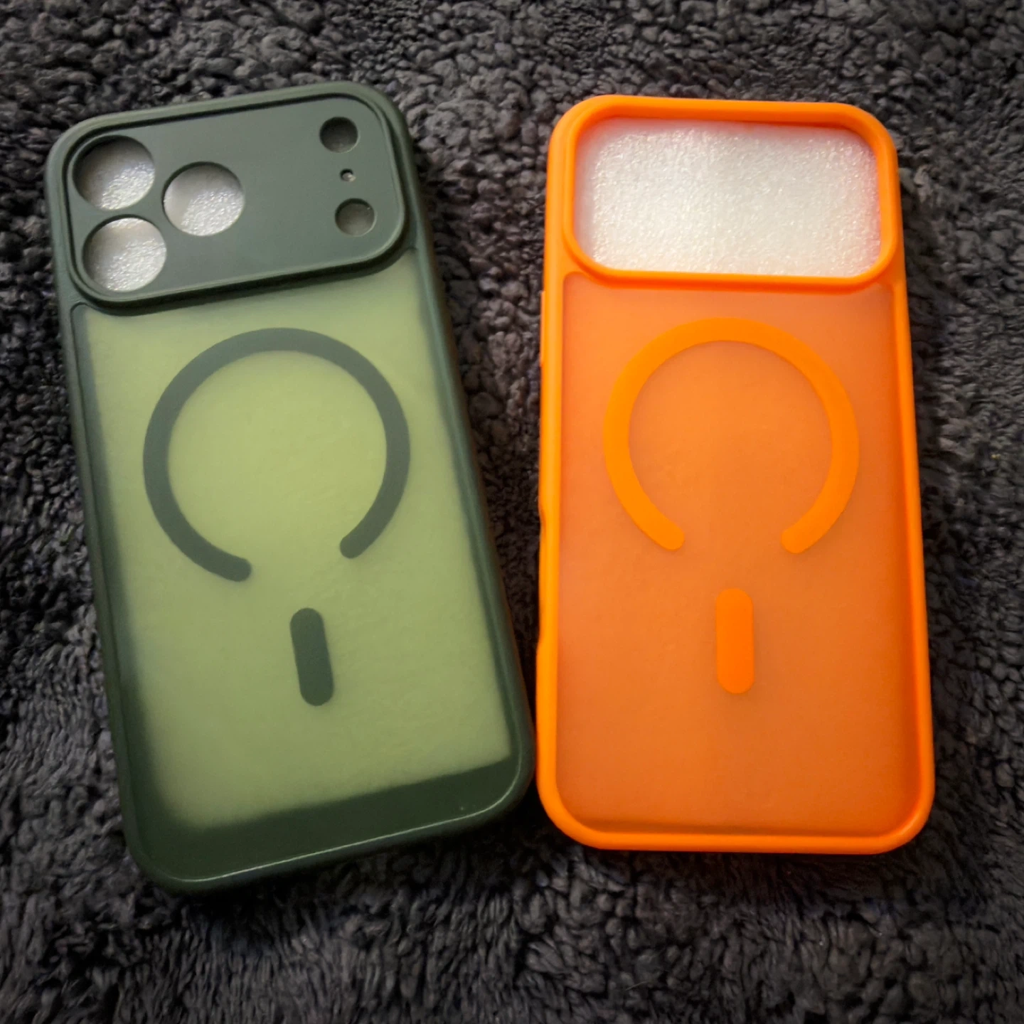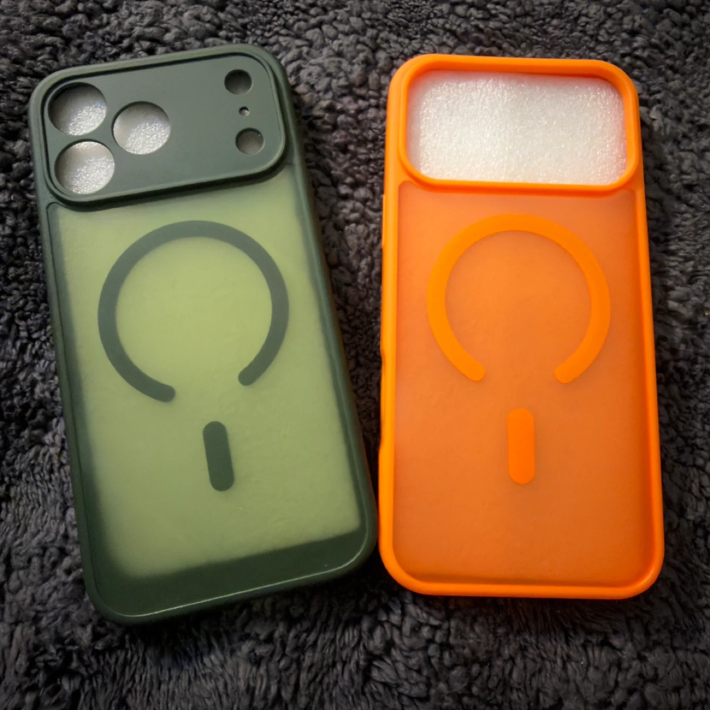 Selling two MagSafe compatible phone cases, one in dark green and one in bright orange. These cases offer protection and MagSafe charging convenience. They're designed for a snug fit and easy access to all ports and buttons.