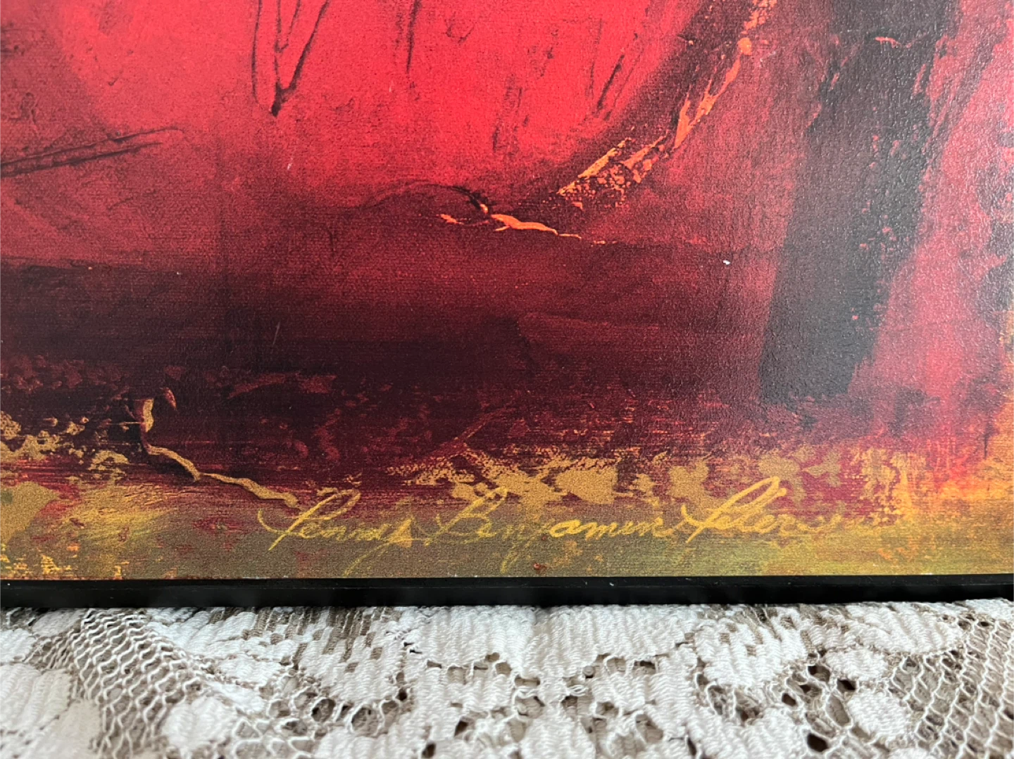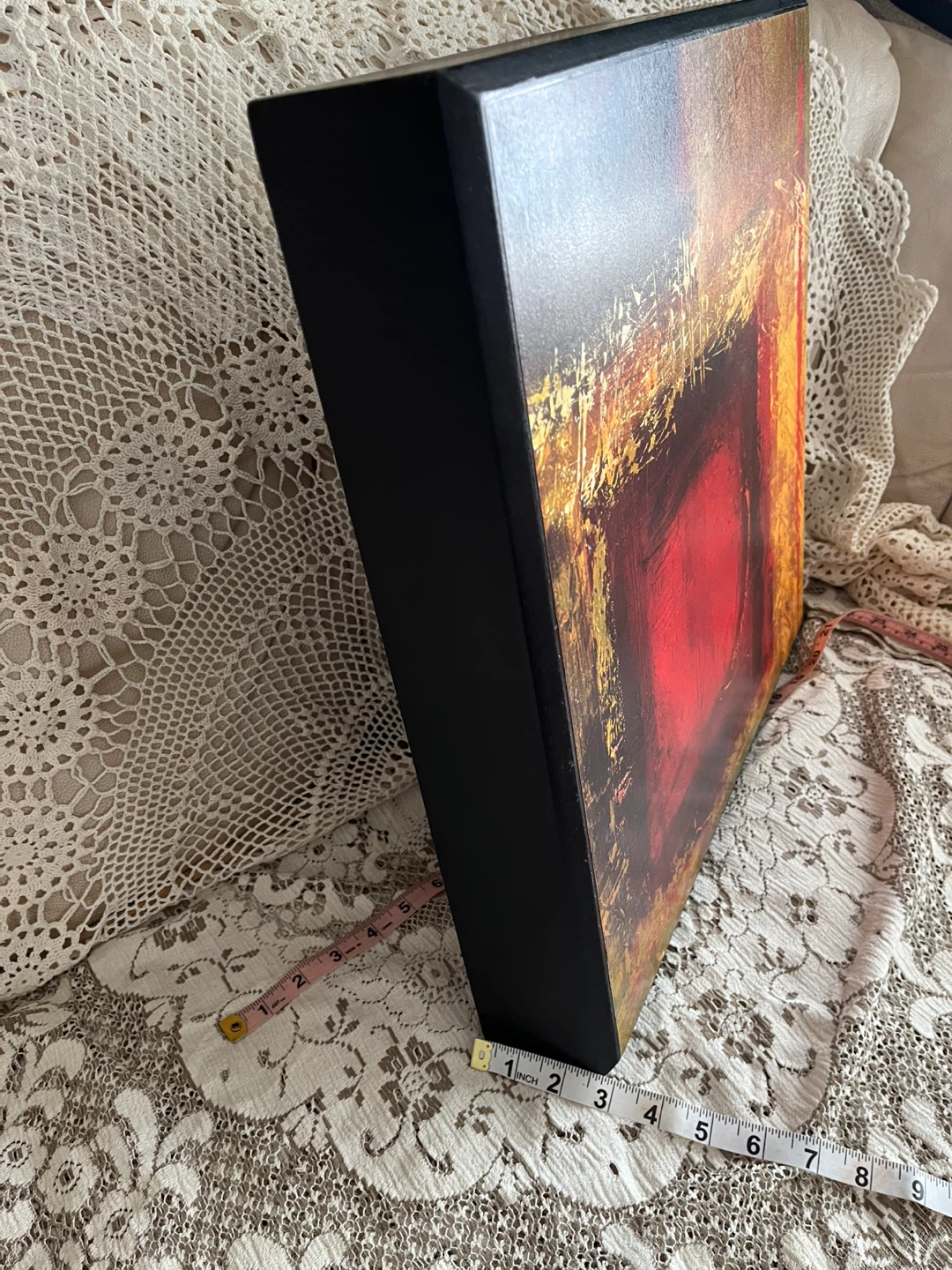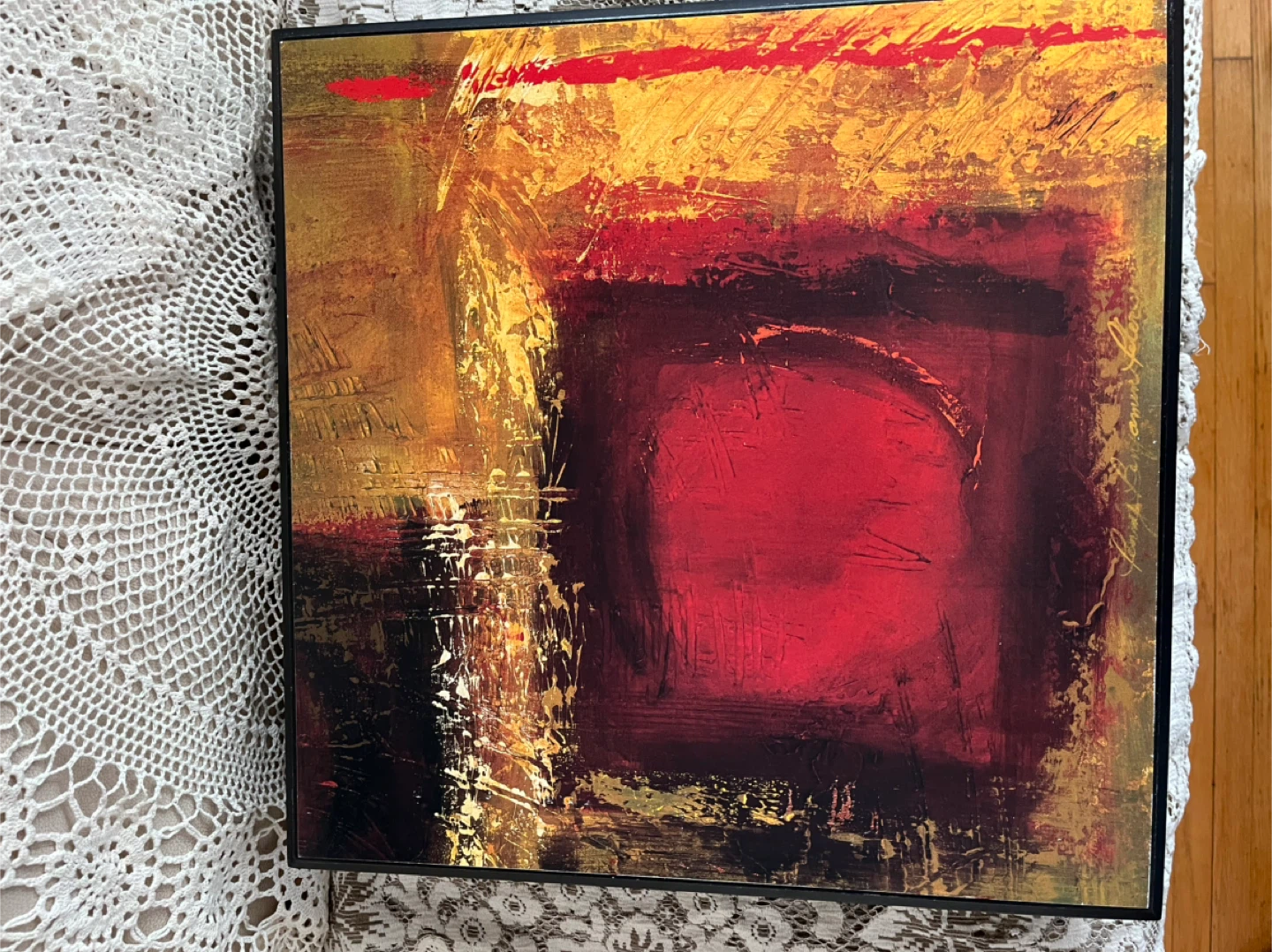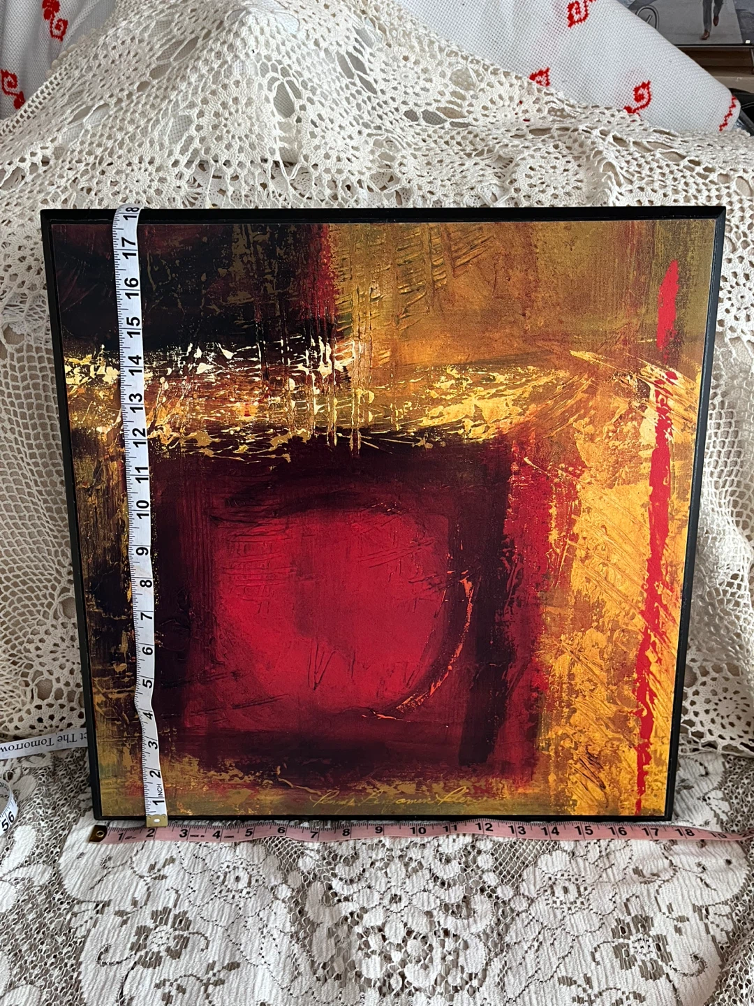 This abstract wall art piece features bold red and gold tones. It appears to have texture ( the original piece would’ve been textured), but it has a smooth surface. It measures approximately 18x18 inches.