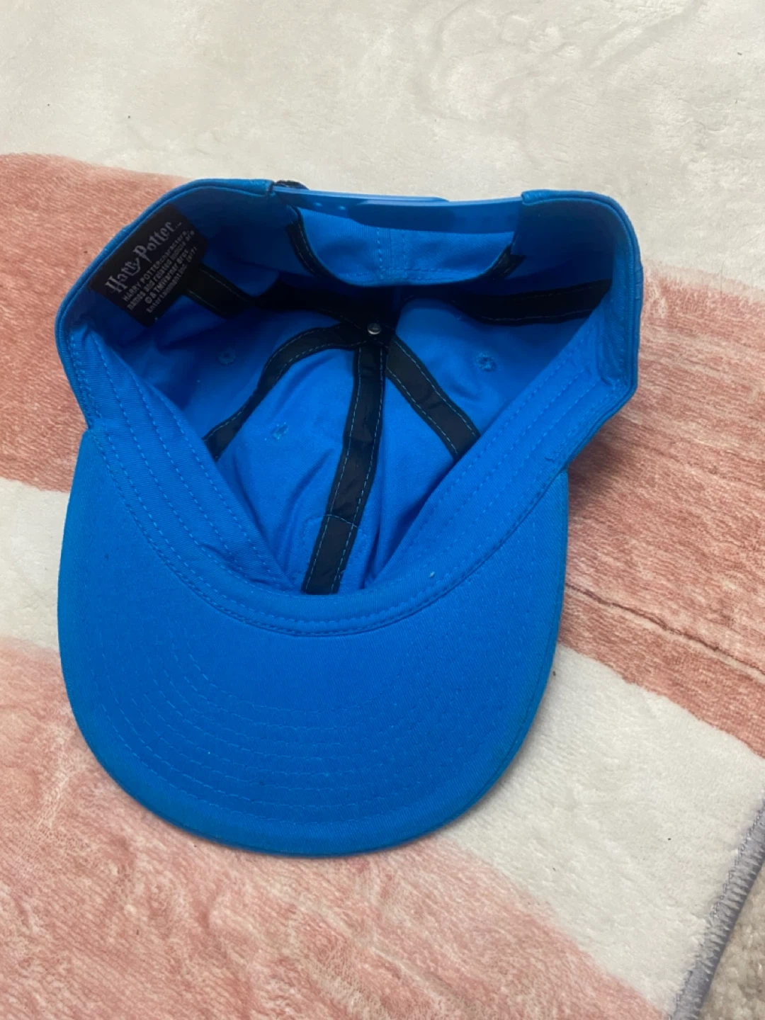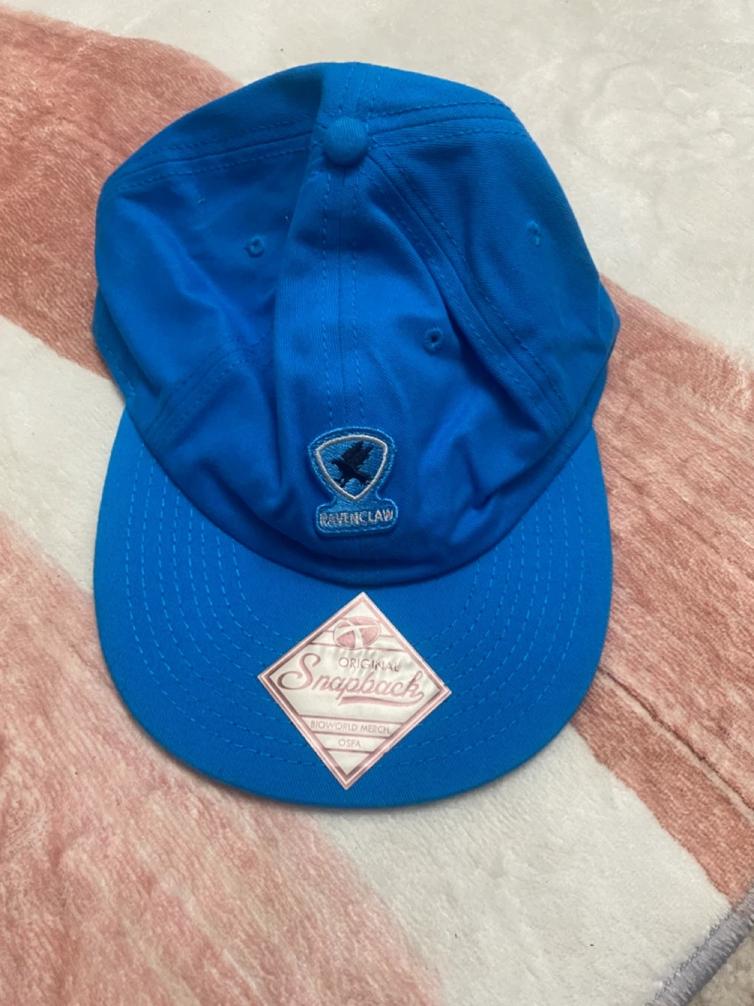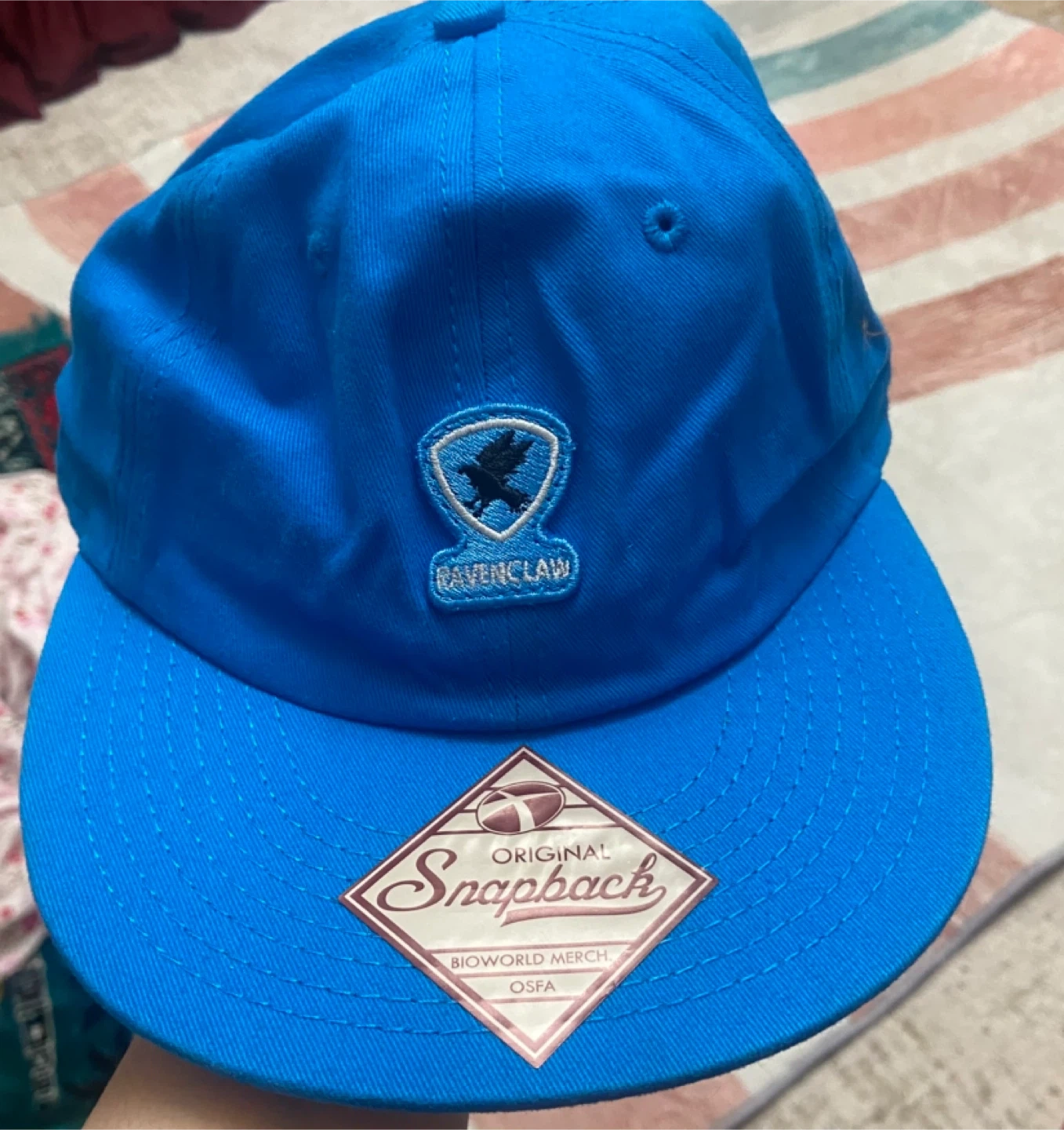 This is a blue Harry Potter Ravenclaw snapback hat. It's made by Bioworld Merch and is OSFA (One Size Fits All). The hat features the Ravenclaw crest. It's a fun accessory for any fan!