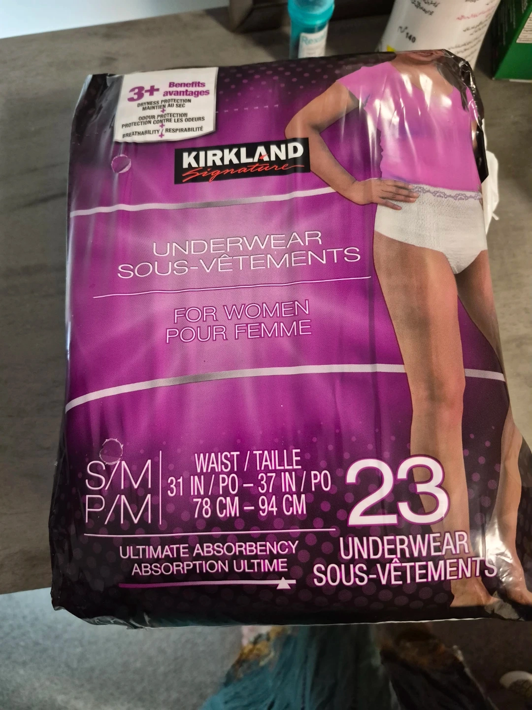 Kirkland Signature women's underwear. This package contains 23 diapers like underwear in size small designed for waist sizes 31-37 inches or 78-94 cm. They offer ultimate absorbency.