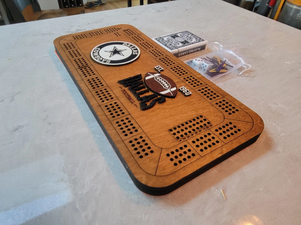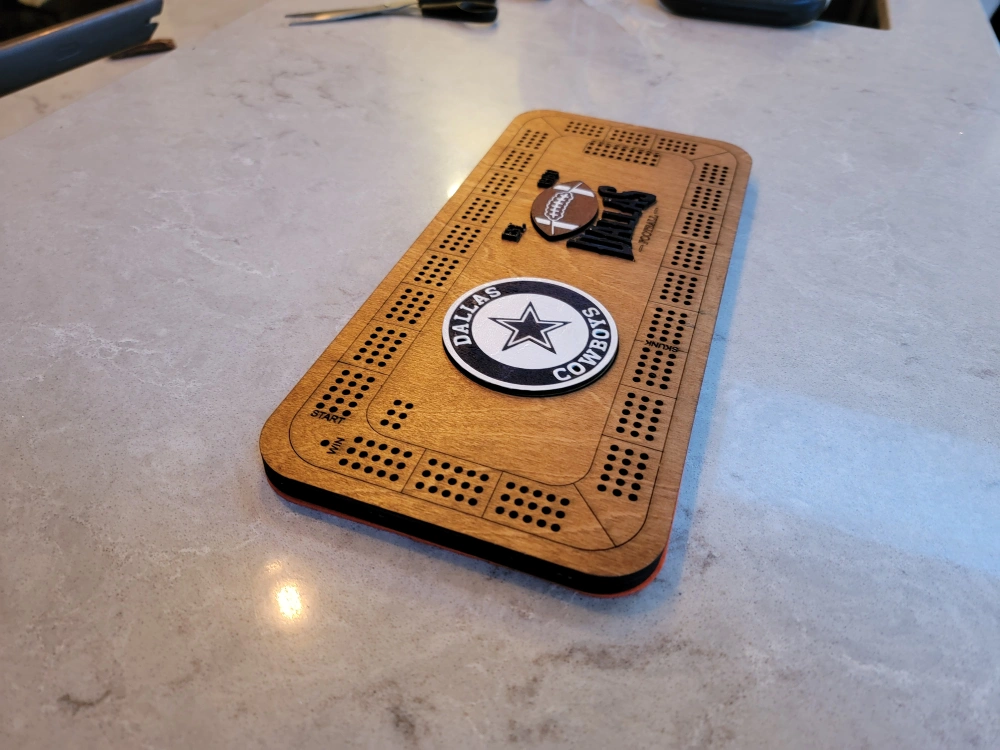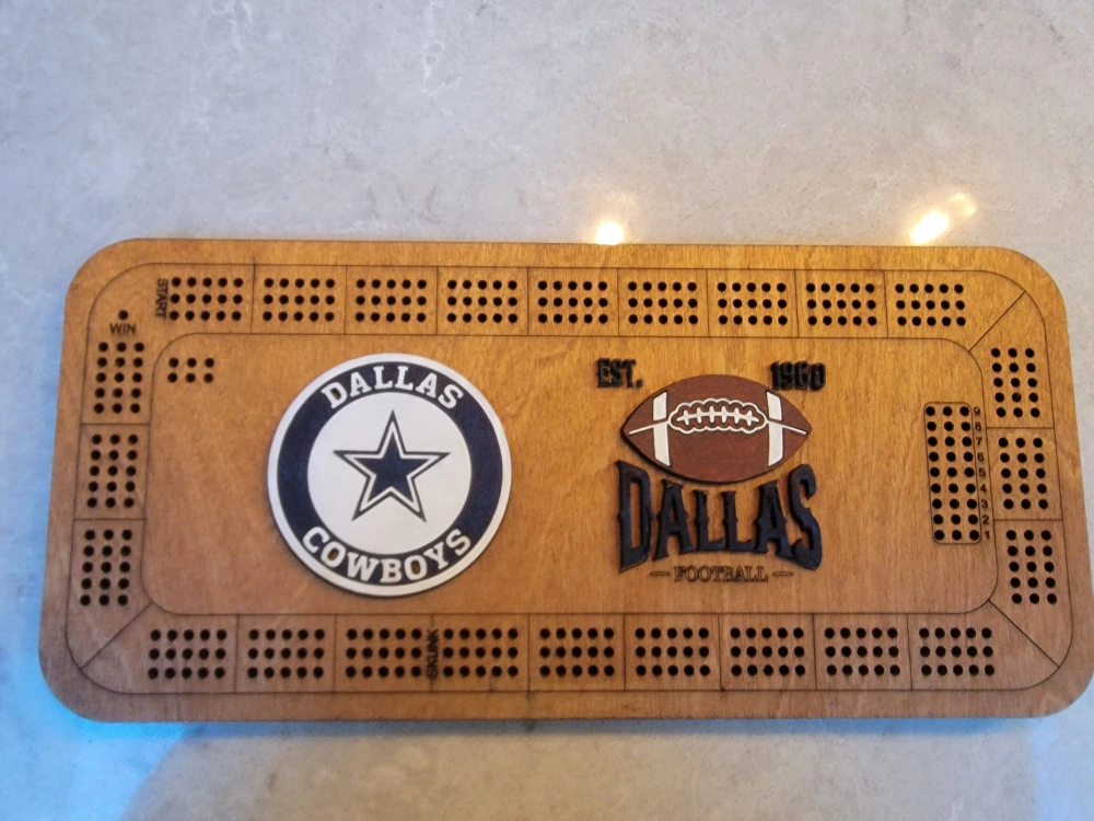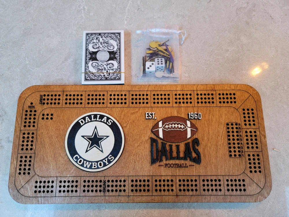 Custom-made cribbage board. This one features Dallas Cowboys logo. Can custom do most sports teams including hockey etc. Includes game pieces. Cards are shown for scale. Laser Cut Wooden construction.