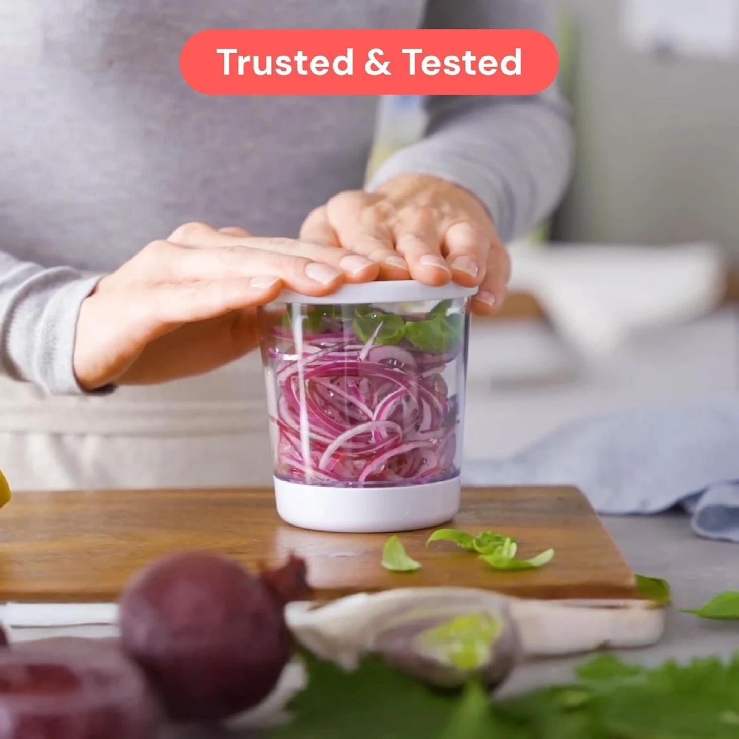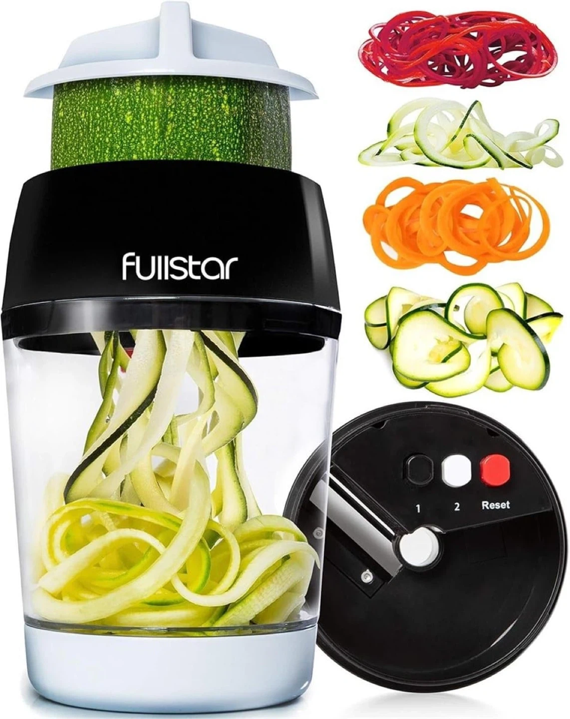 Easily create vegetable noodles with this Fullstar spiralizer. It comes with three different blade options for various cuts, including ribbon and combination styles. The compact design makes it a handy kitchen tool!