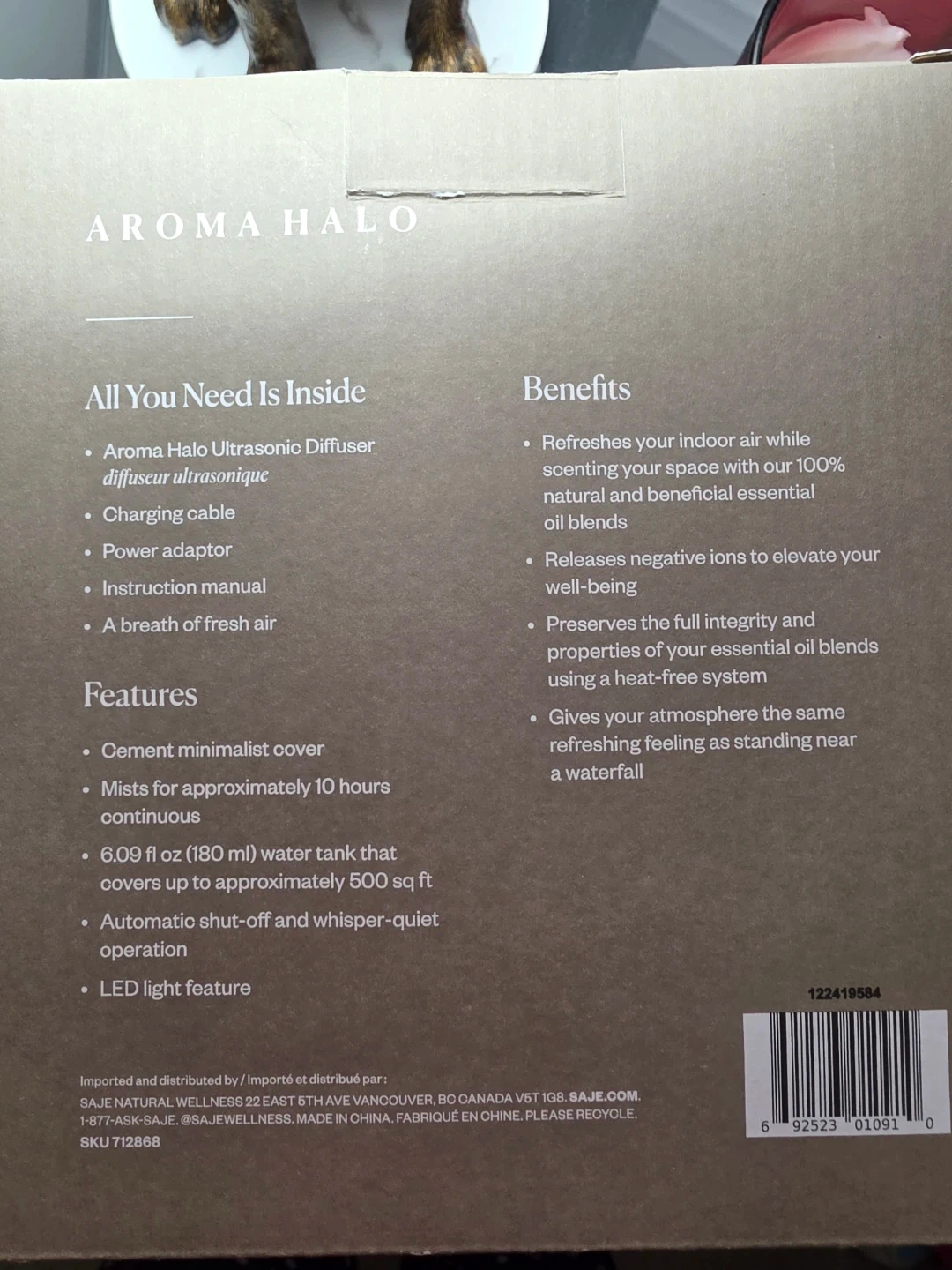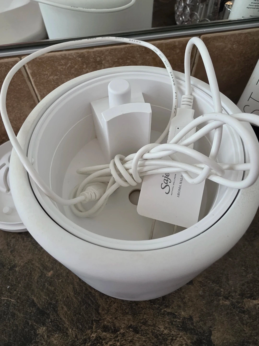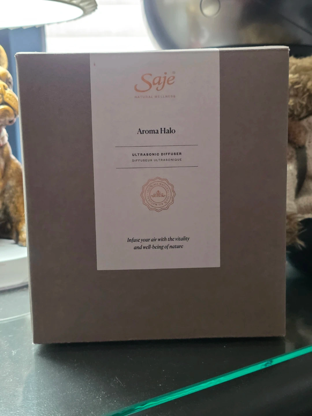 Excellent NEW & clean condition! This Saje Aroma Halo Ultrasonic Diffuser gently scents your space. It features a cement minimalist cover, covers up to 500 sq ft, and mists for approximately 10 hours continuous. It's an automatic shut-off and whisper-quiet operation.