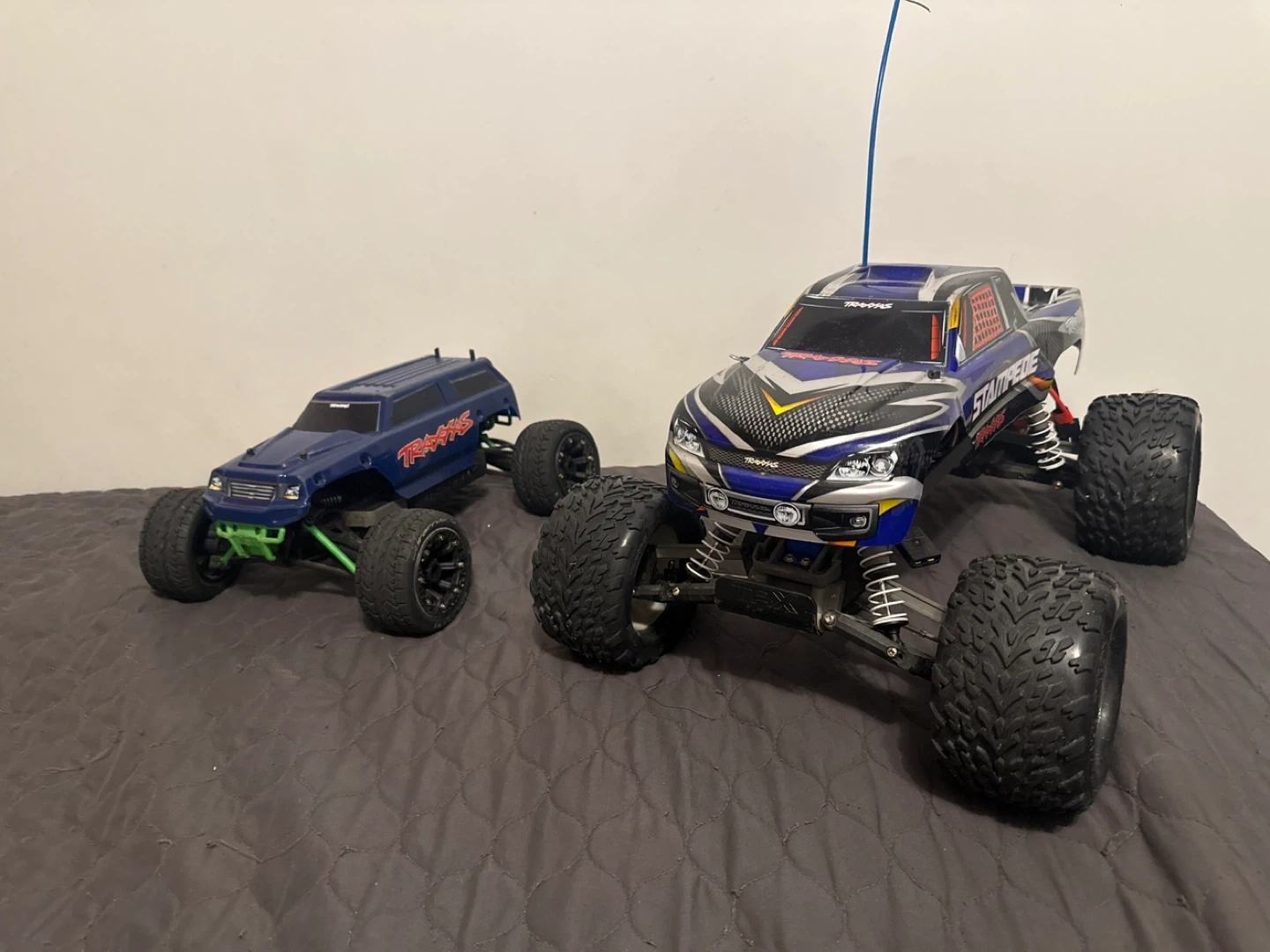Two Traxxas remote control monster trucks. One is blue with green suspension. The other is blue and silver with a carbon fiber-look hood. Both have large, knobby tires. I am selling it all together. It comes with the controller and parts.