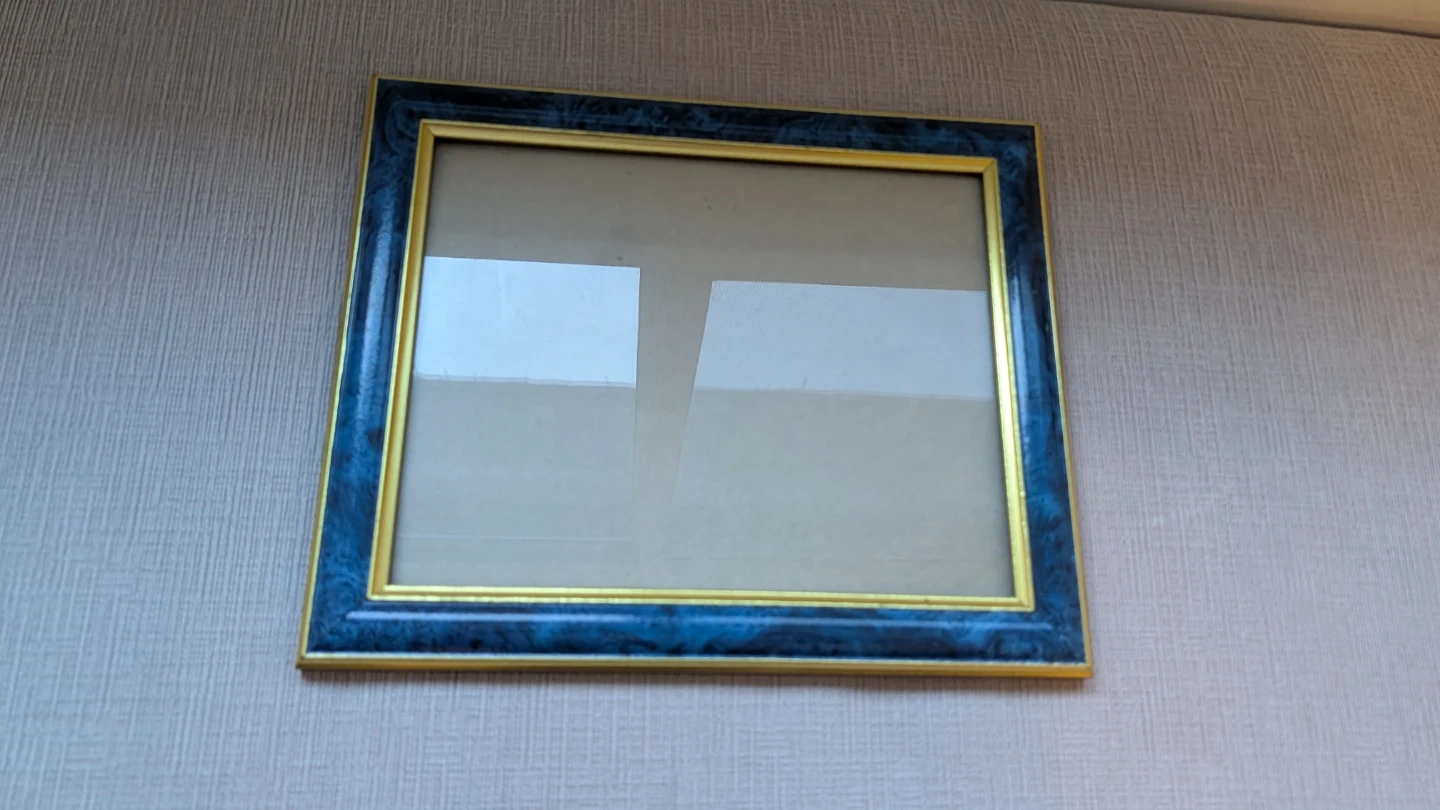 A decorative picture frame with a blue and gold finish. It can stand on its own or be hung on a wall. Glass front is included.
