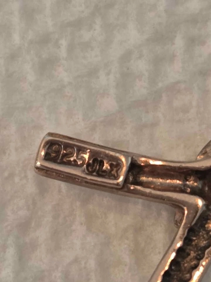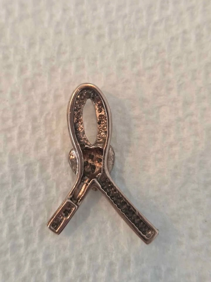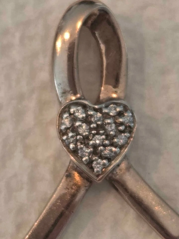 Genuine 925 sterling silver pendant with a heart-shaped center set with clear stones. Marked 925 JLK on the back. Ribbon-style design often worn for love, remembrance, or awareness. Sterling silver, sparkling heart detail. Pendant only. Clean, gently worn condition. Great as a gift or for everyday use. Pick up in Oshawa near Ritson and Hillcroft