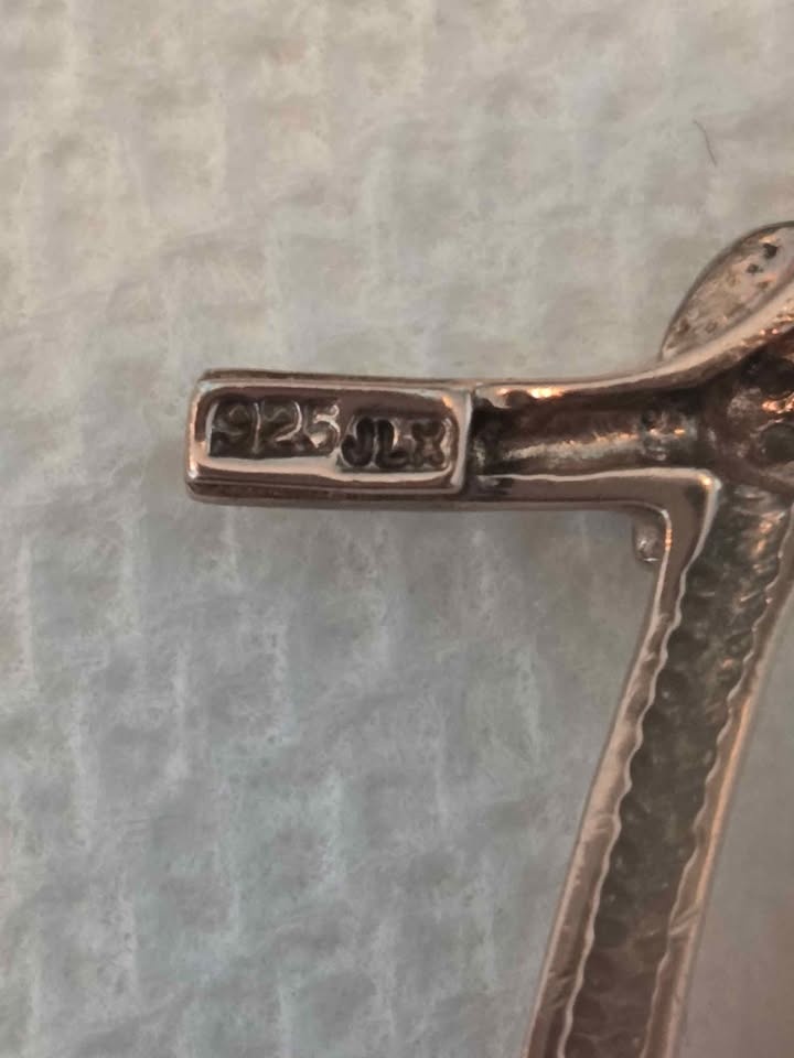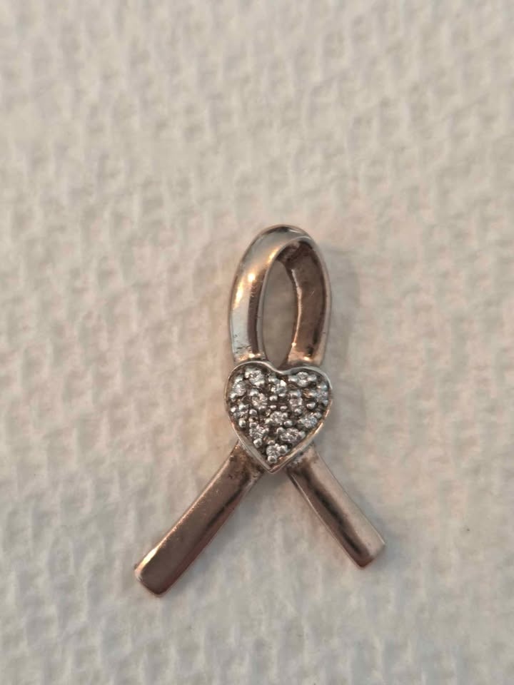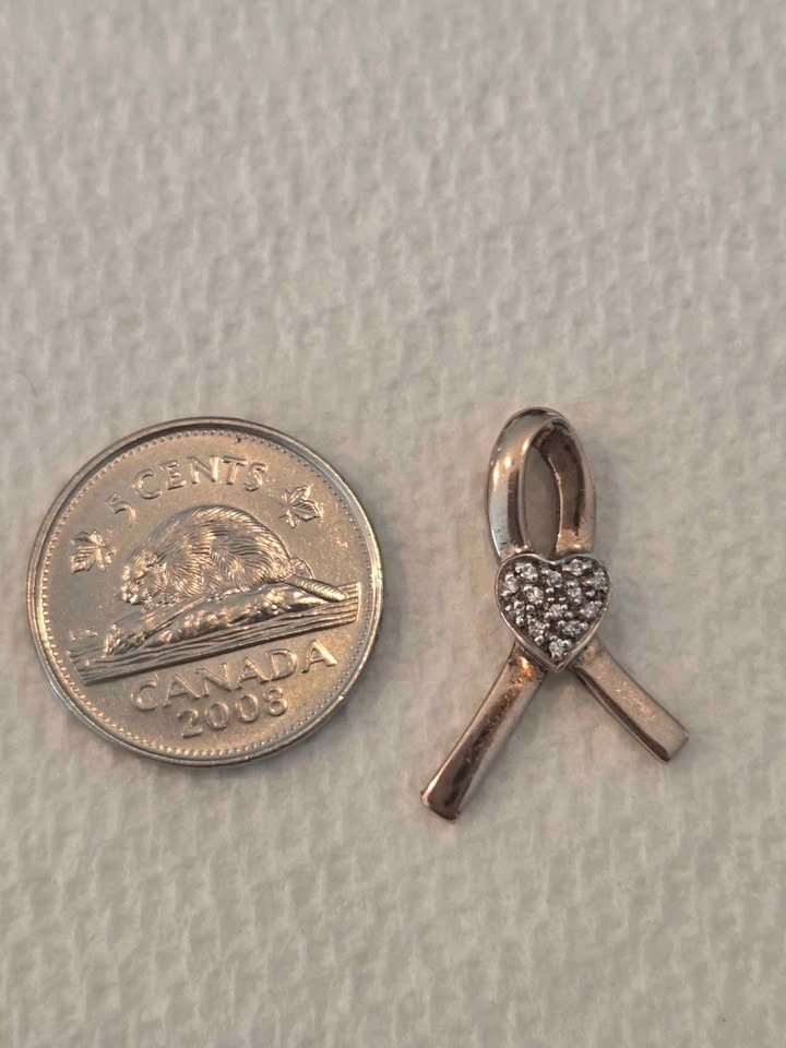 Genuine 925 sterling silver pendant with a heart-shaped center set with clear stones. Marked 925 JLK on the back. Ribbon-style design often worn for love, remembrance, or awareness. Sterling silver, sparkling heart detail. Pendant only. Clean, gently worn condition. Great as a gift or for everyday use. Pick up in Oshawa near Ritson and Hillcroft
