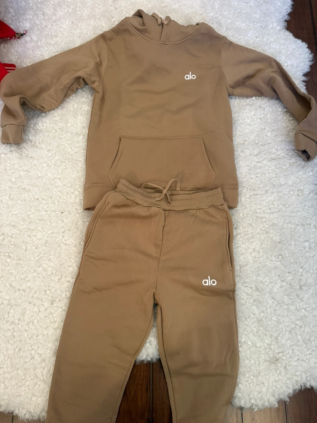 Selling a cozy ALO matching set, includes a hoodie and pants. The set is in a beautiful tan colour. Perfect for lounging or a casual day out!