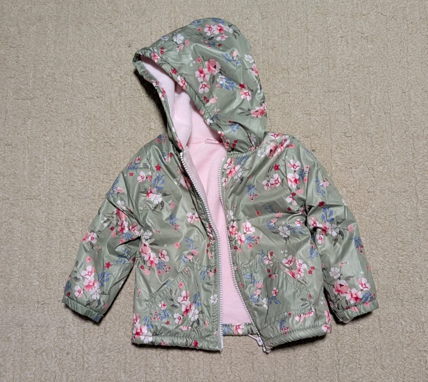jacket from Penneys with a floral print on one side and pink fleece lining on the other. It's a size 18 months. This jacket's great for keeping little ones warm and stylish during cooler weather!