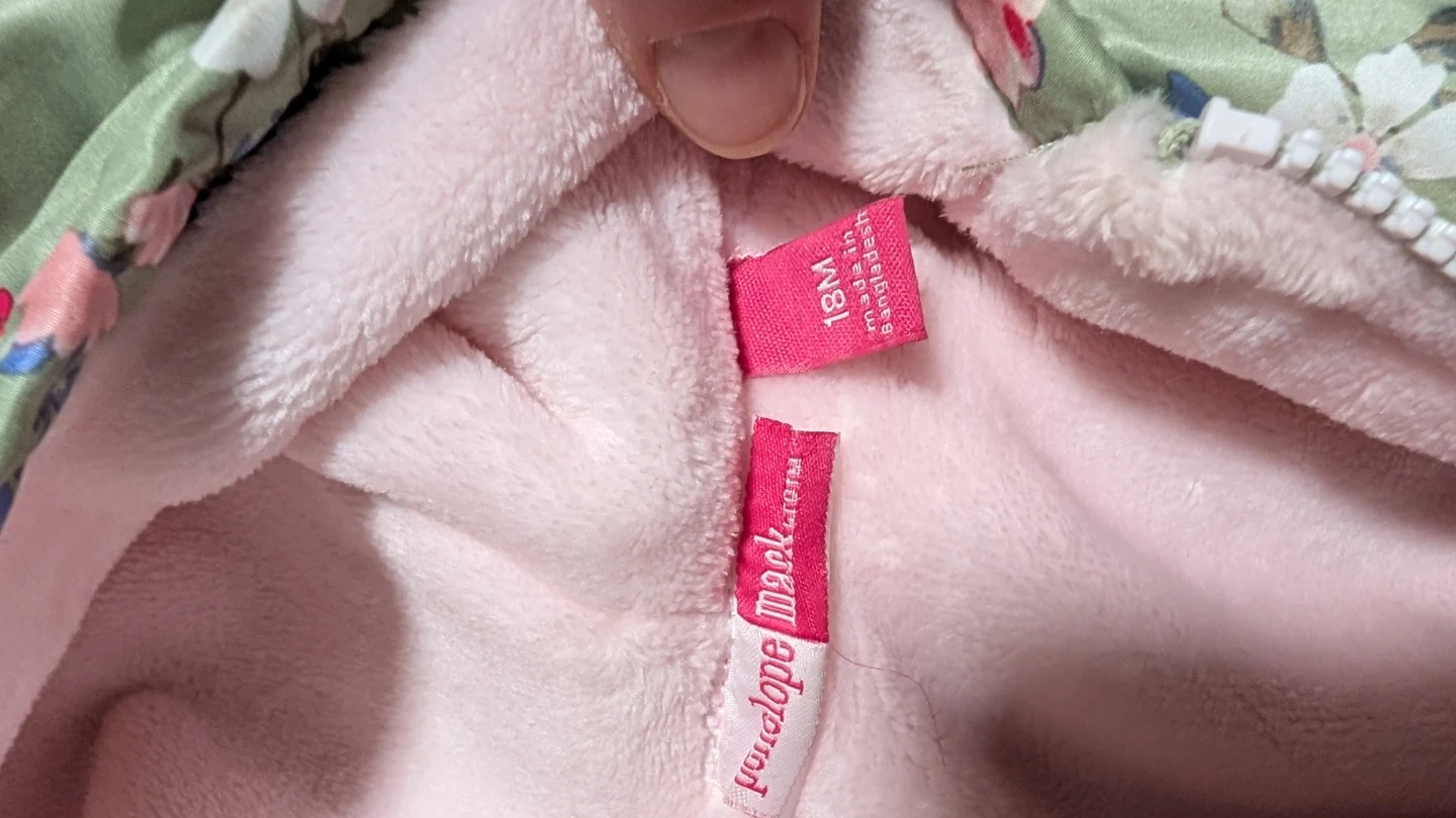 jacket from Penneys with a floral print on one side and pink fleece lining on the other. It's a size 18 months. This jacket's great for keeping little ones warm and stylish during cooler weather!