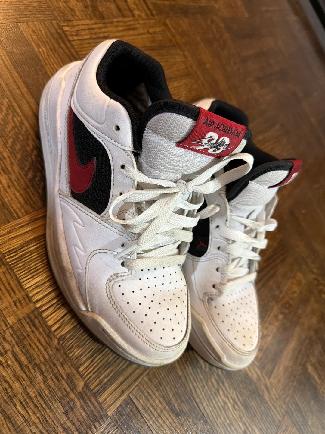 A pair of Nike Air Jordan 1 Mid sneakers in white, red, and black. These shoes are white with red and black accents, featuring the iconic Air Jordan branding on the tongue. They're great for everyday wear.
