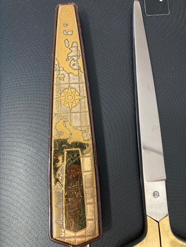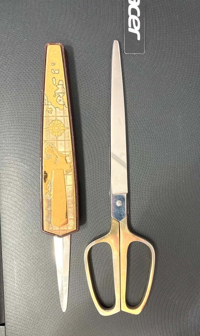 Vintage pair of letter opener scissors made in Germany by Brown & Bigelow. They have a gold-tone finish. The handles feature a map of the world with a compass rose.