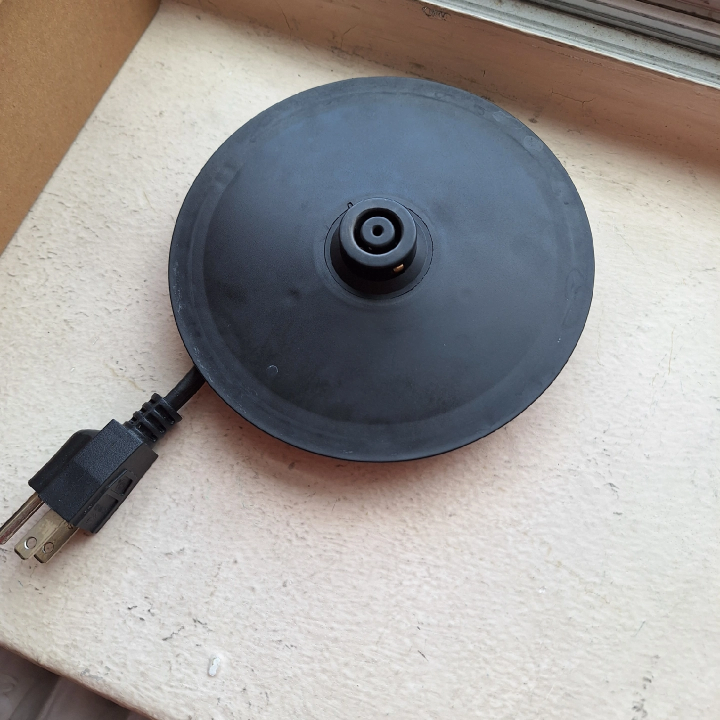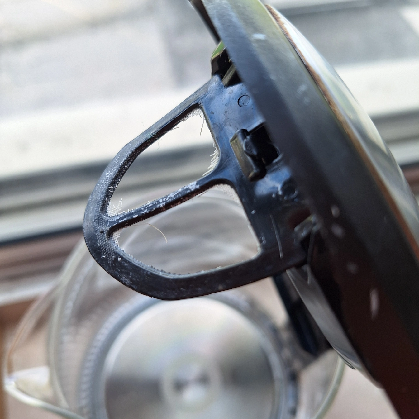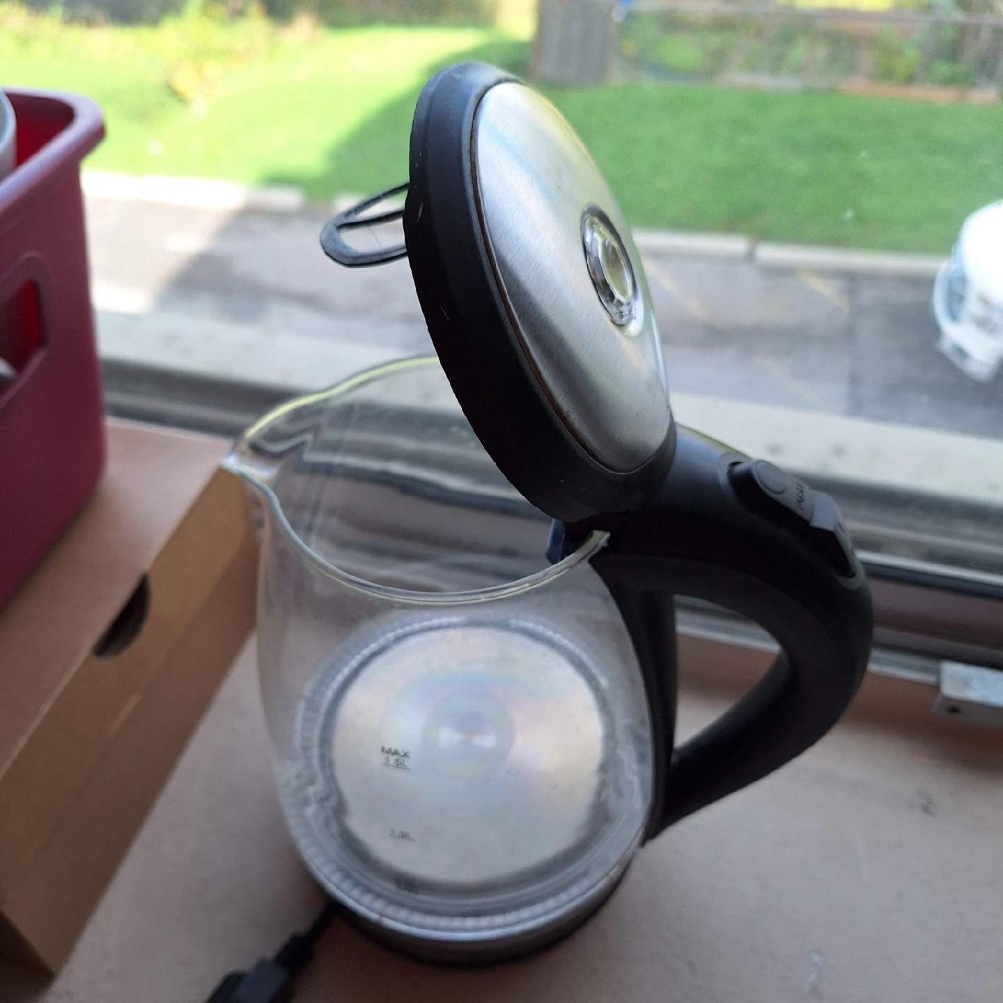 Selling a used electric kettle. It's made of glass and has a black handle and base. Perfect for making tea or coffee! Works well, quickly boils water, mesh filter missing but doesn't affect use.