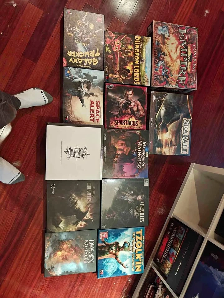 5Spartacus 60 Etherfield a kickstarted edition (unplayed) 200 Dead men tell no tales (played once) 80 Seafall legacy 50 (unplayed) Mansions of madness first edition 60 Space alert 40 Galaxy trucker 40 Dungeon Lords 40 Tzolkin 40 (sold) Conquest of the empire 60