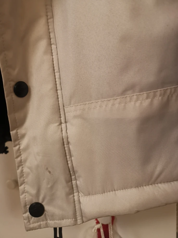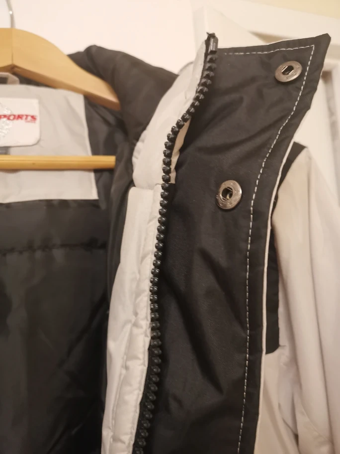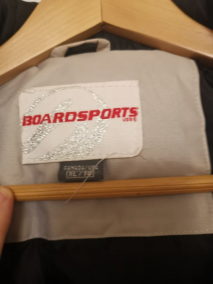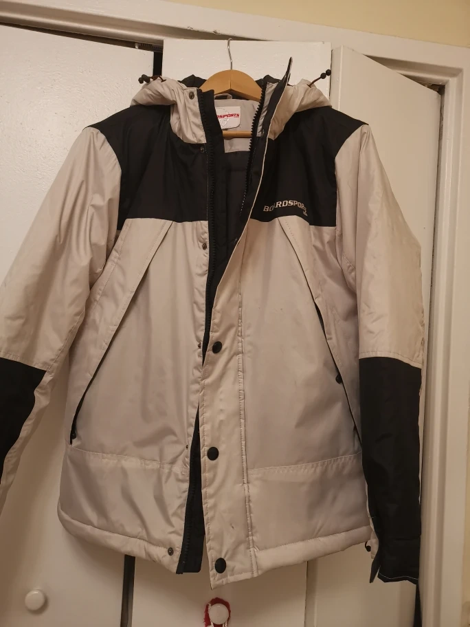 27Men's Boardsports puffer jacket. Size XL. Beige and black colour block design. Zipper and button closure. Hood included. Good condition.