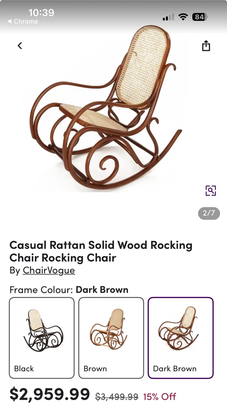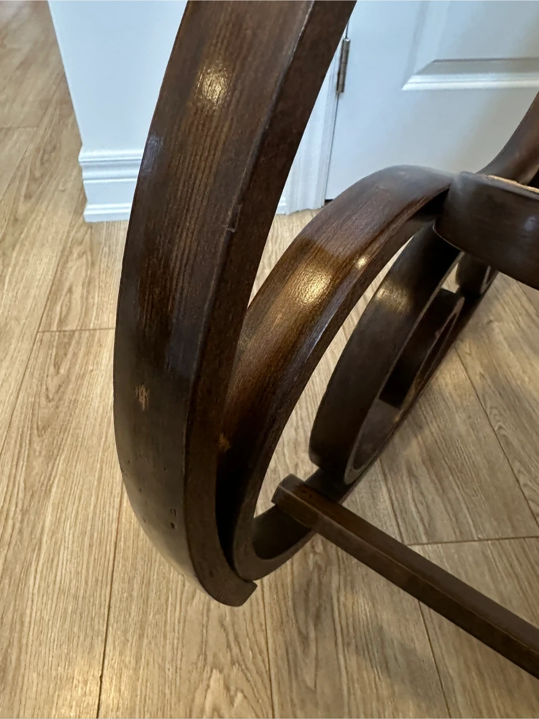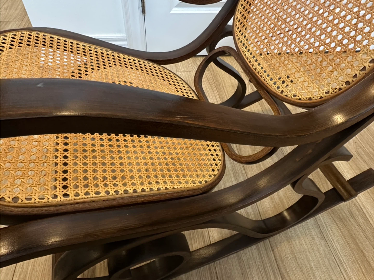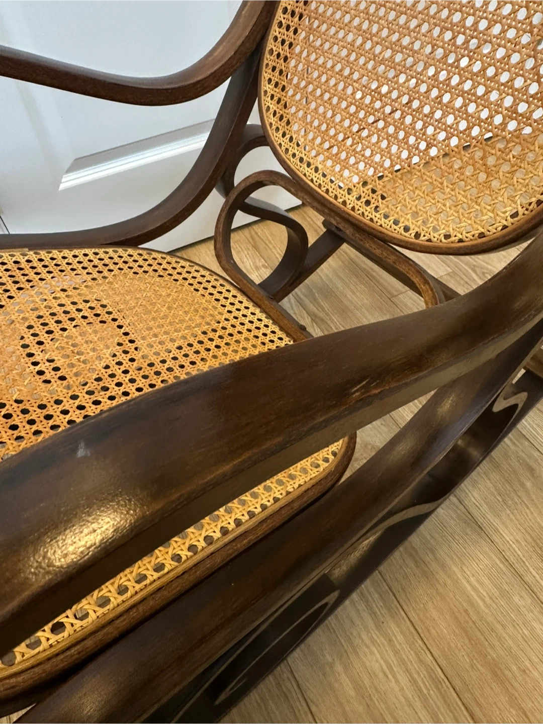 A classic bentwood rocking chair with a woven cane seat and back. It’s in impeccable condition. It's finished in a dark stain, showcasing its elegant curves. This chair would be a lovely addition to any cozy nook!
