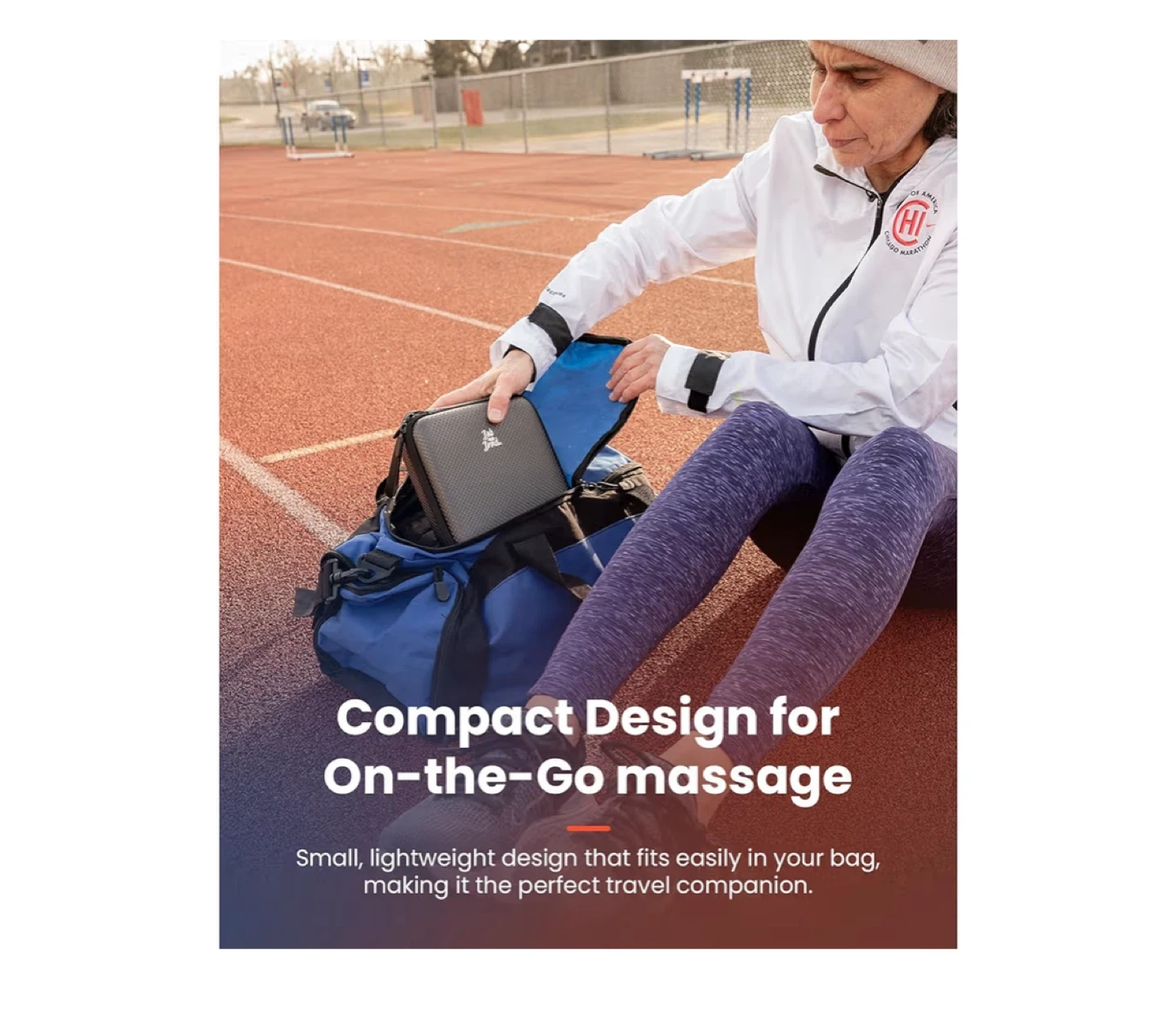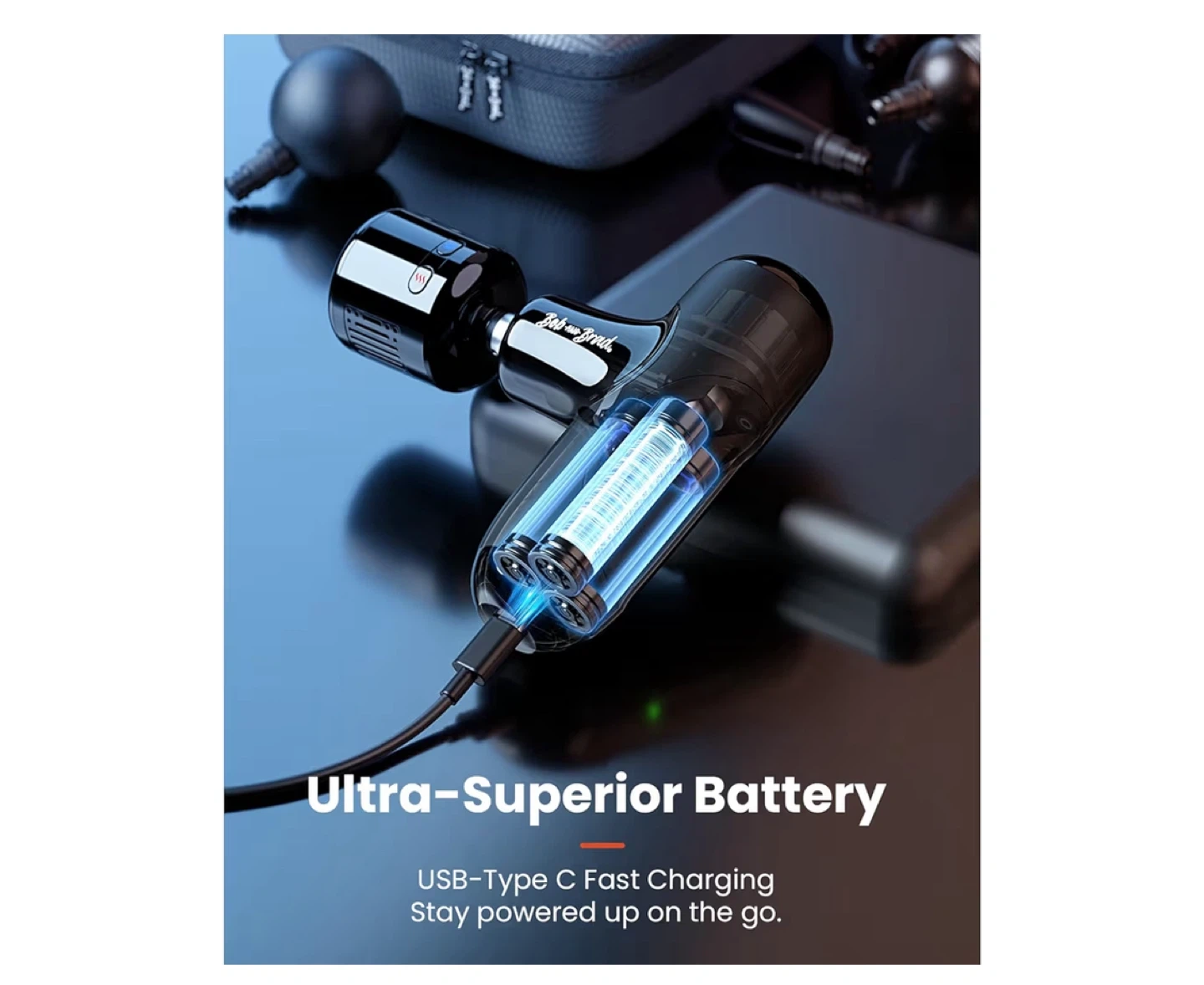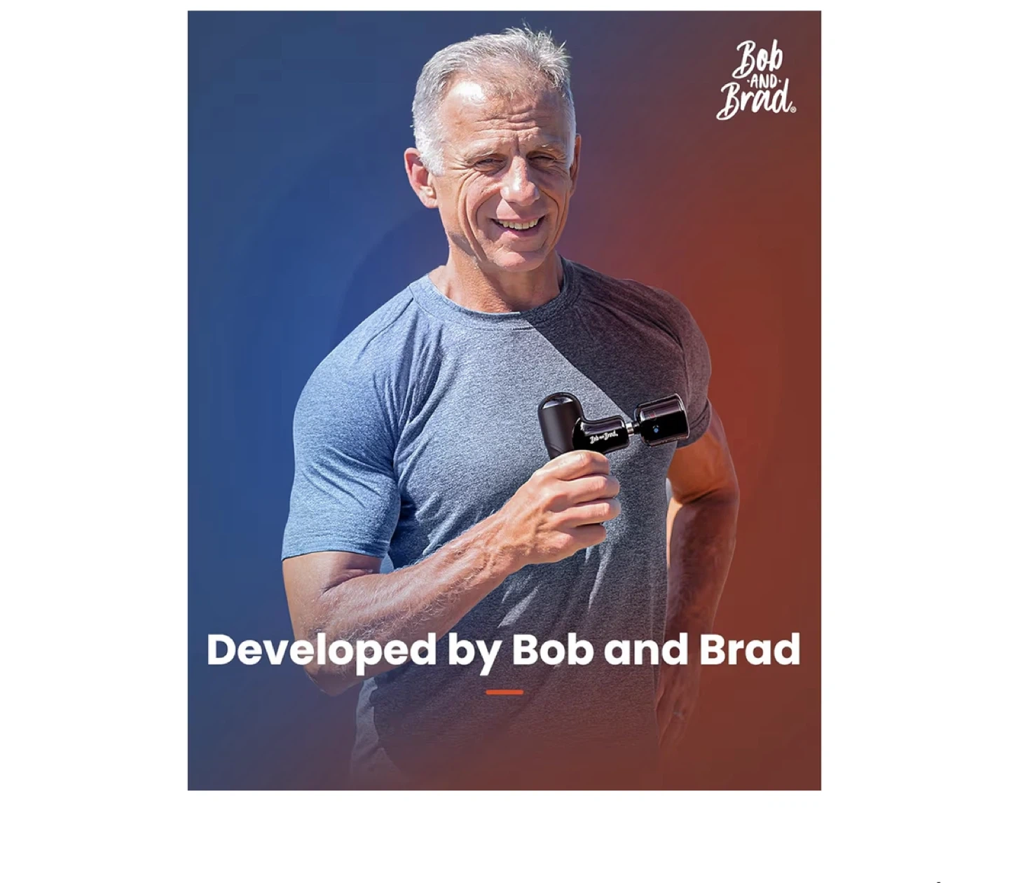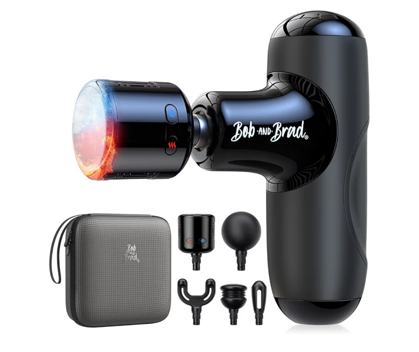5Selling a Bob and Brad massage gun. It comes with multiple attachments and a carrying case. It features hot and cold massage options and is designed to be compact and portable, making it easy to take on the go