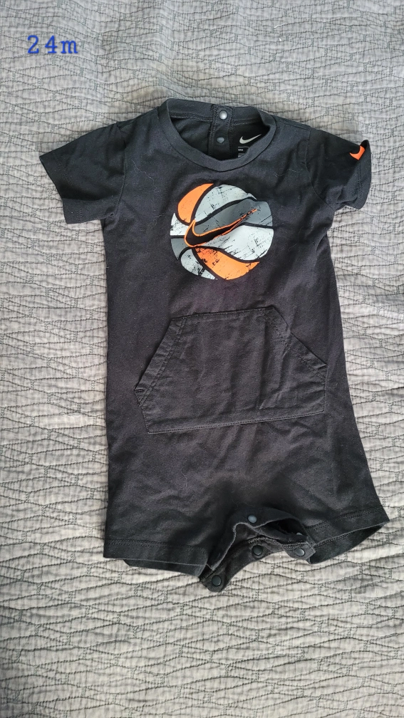 Black Nike romper with a basketball graphic. The romper has a front pocket. Size 24 months. used few times