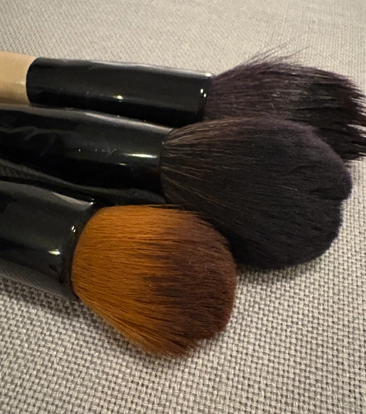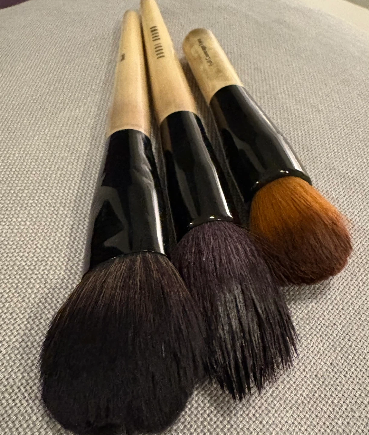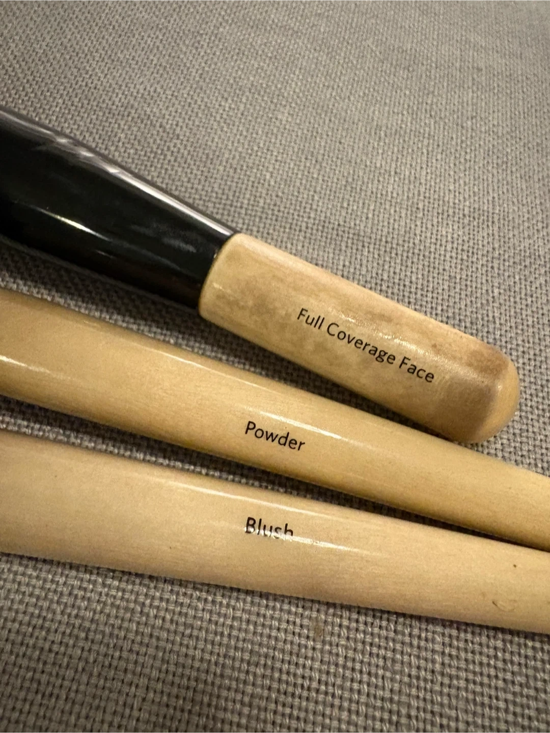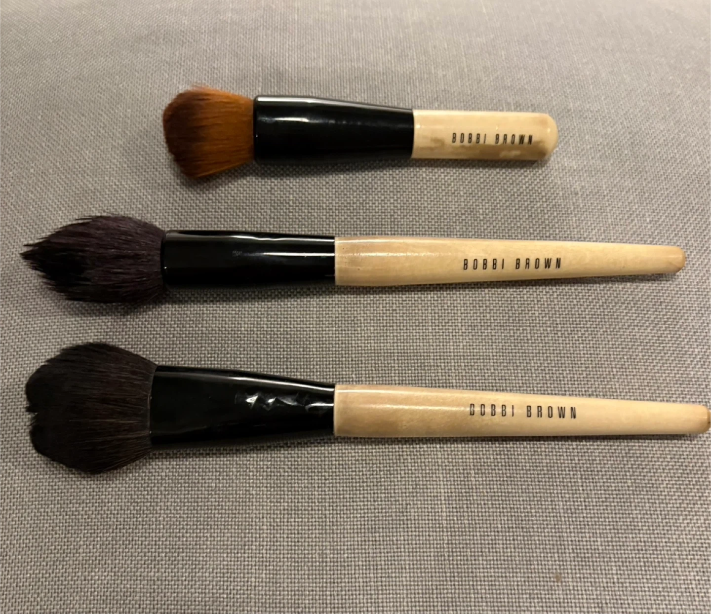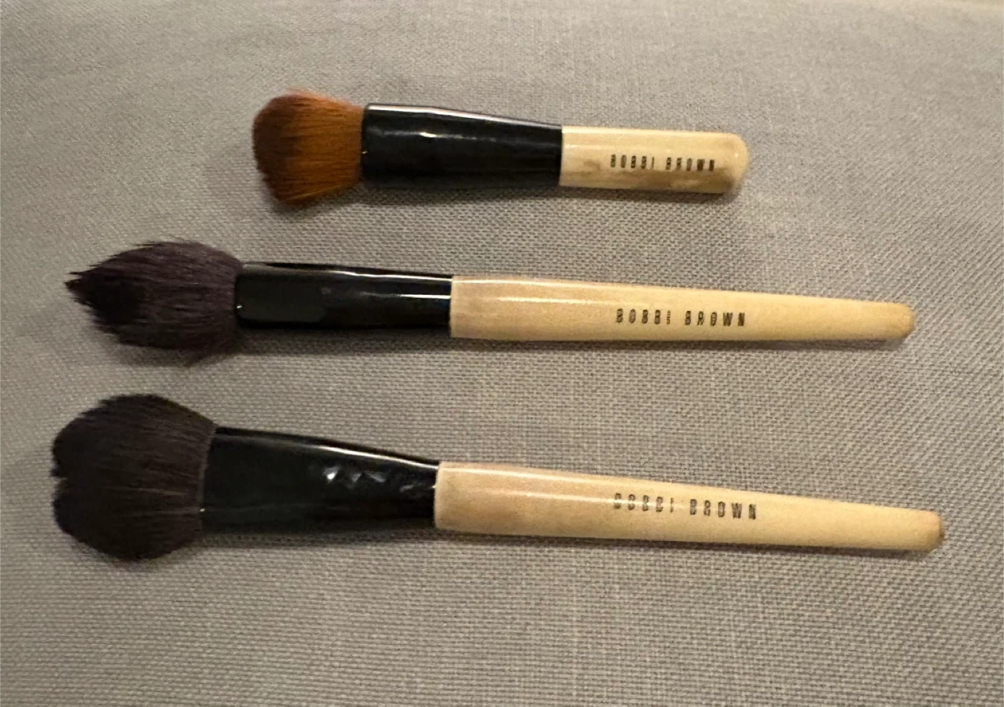217Bobbi Brown Professional Make Up Brushes - Extra Set. Original value over $300. They were used for travel and have been cleaned. Signs of wear (discolouration) on the wood handles from use and cleaning. Excellent condition otherwise. Includes: 1 Powder Brush 1 Blush Brush 1 Full Coverage Face Brush
