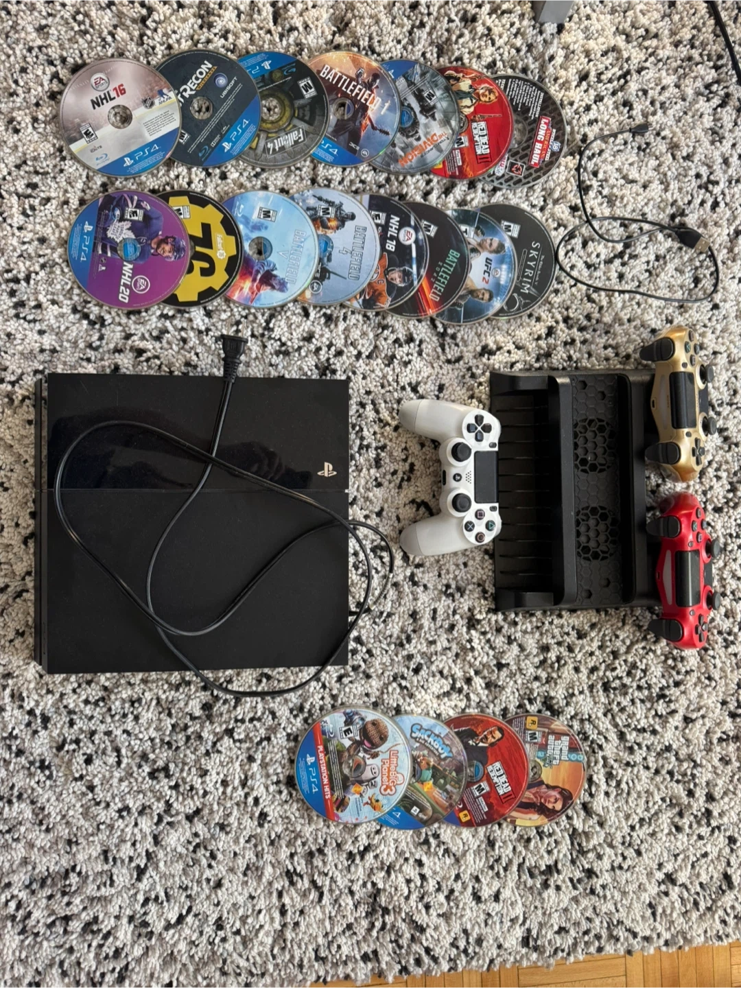 Sony PlayStation 4 Slim console with 3 wireless controllers and charging dock. Includes 15 PS4 games: NHL 16, Battlefield 4, Fallout 4, NHL 20, UFC 2, Skyrim, and more. This bundle is ready for gaming! Only selling the whole package all together.
