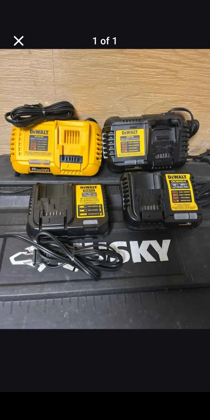 Selling a lot of four DeWalt battery chargers. Includes two DCB112 models and one each of DCB1106 and DCB1104. These chargers are designed for 12V and 20V Lithium Ion batteries. Perfect for keeping your tools powered up and ready to go! DCB118/$80. DCB1106/$70. DCB1104/$40. DCB112/$30