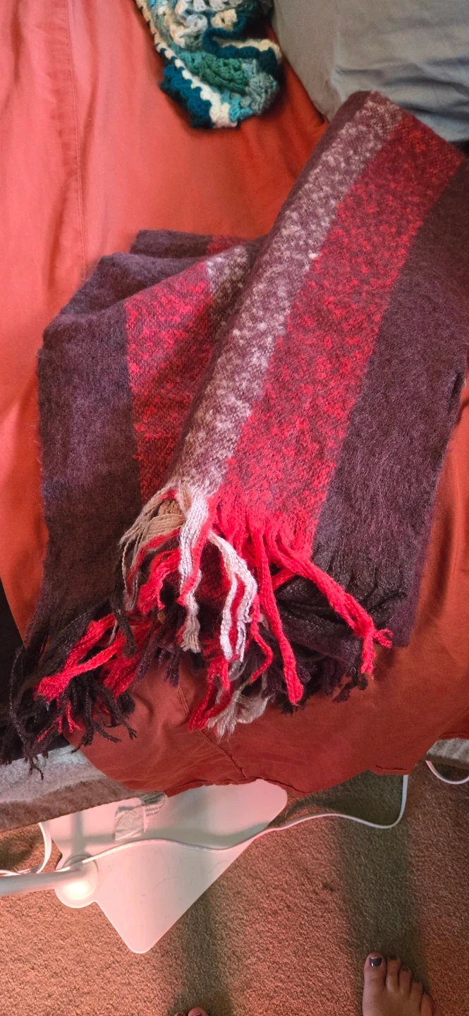This cozy scarf features bold stripes in red, grey, and purple. It's finished with playful fringed edges for a touch of flair. It's perfect for adding a pop of colour to any outfit on a chilly day!