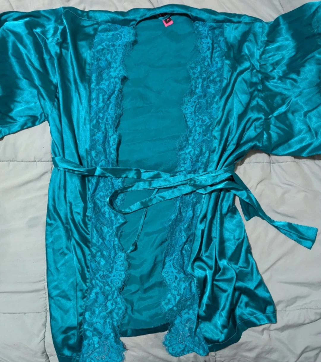 Here's a pretty teal robe with lace trim! It's in great condition and would be perfect for lounging around the house. The robe has a tie at the waist. It's a beautiful colour! New never worn. Just a tad wrinkly from being in a dust bag!