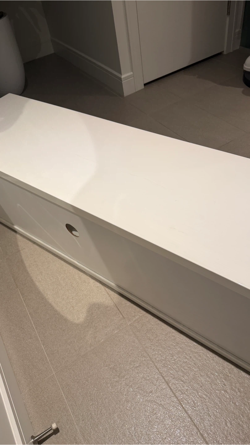 This is a sleek white entertainment stand with two side cabinets and open shelving in the middle. It has cable management holes at the back. Perfect for organizing your media devices and accessories!