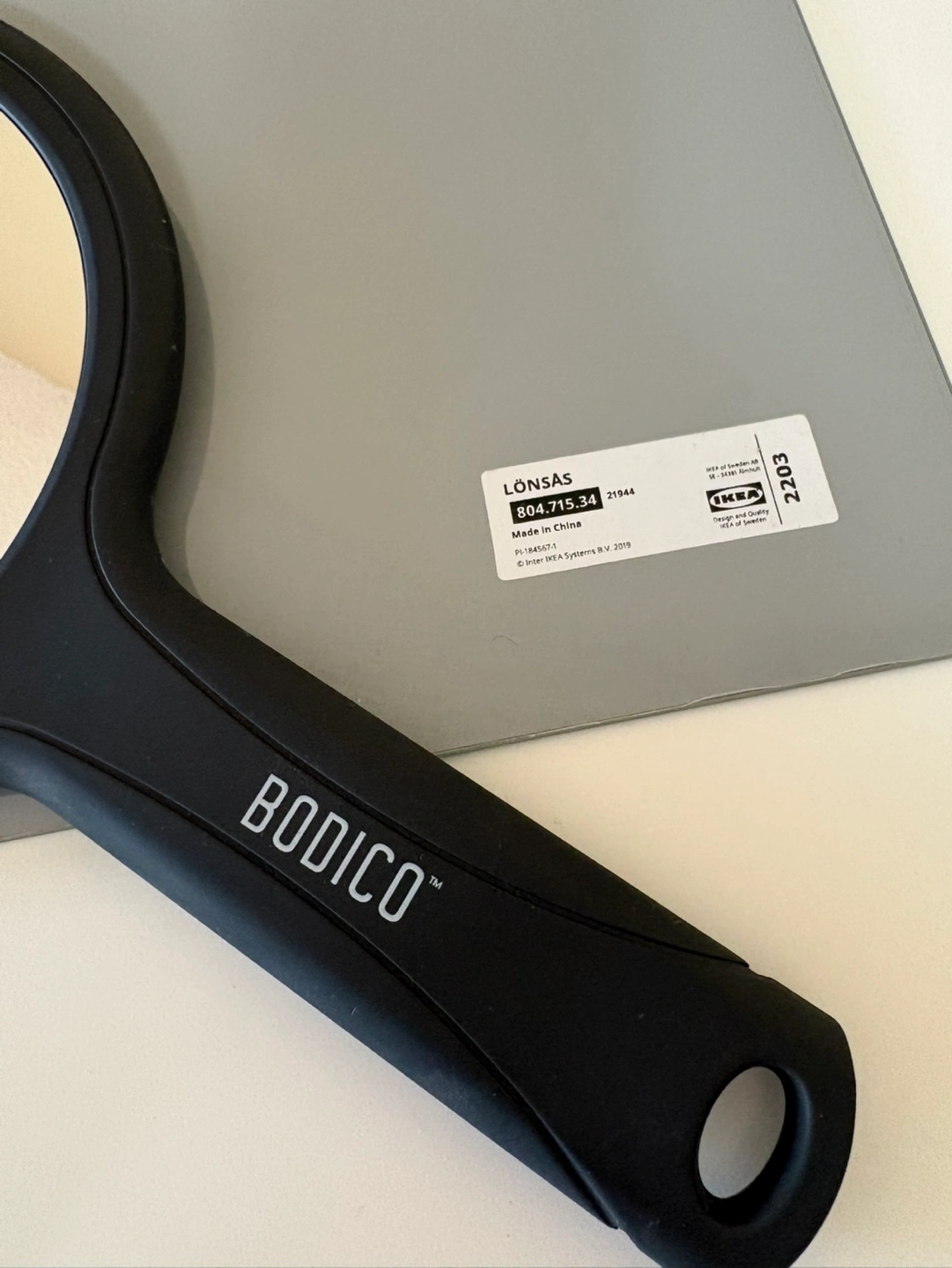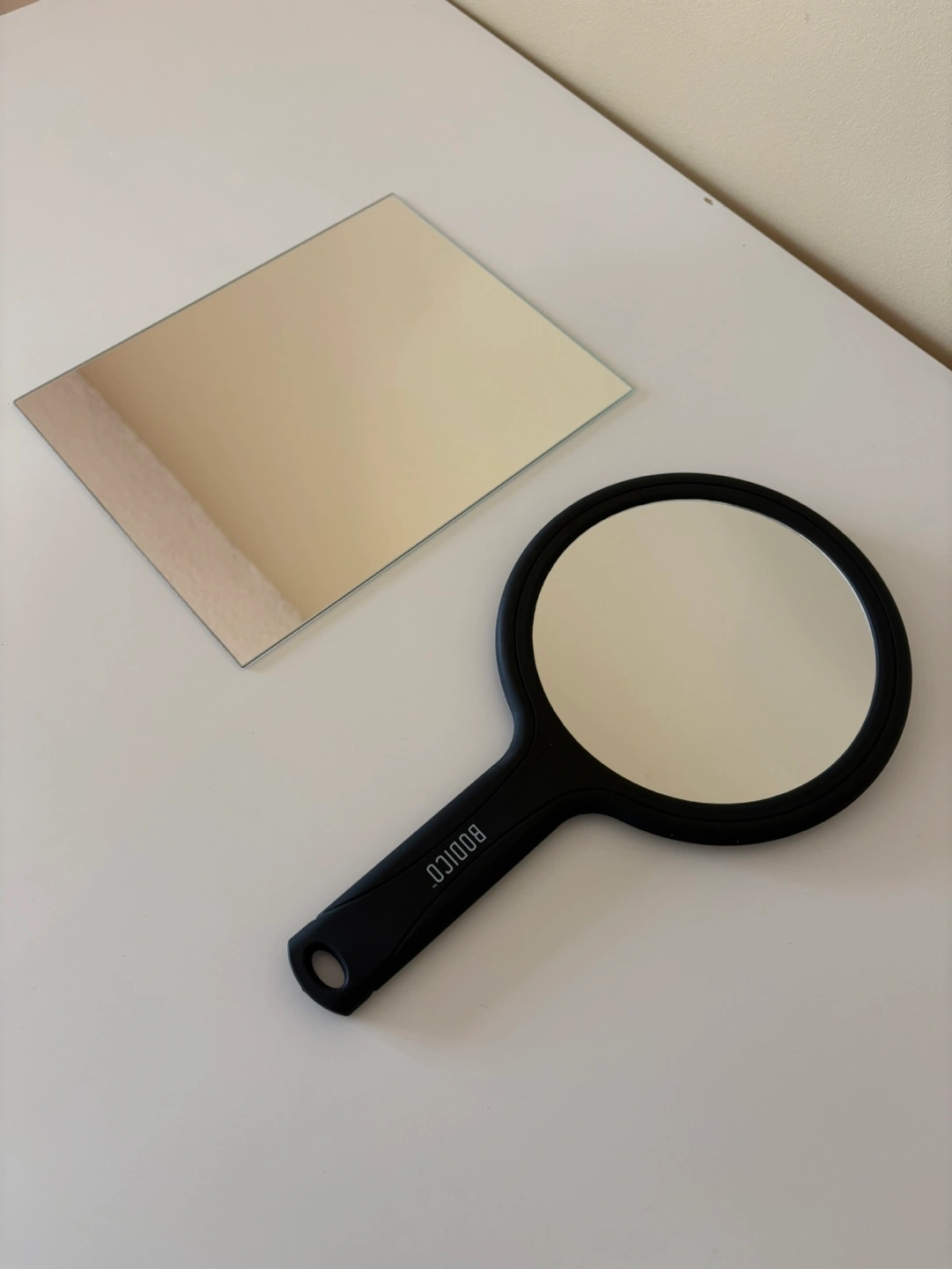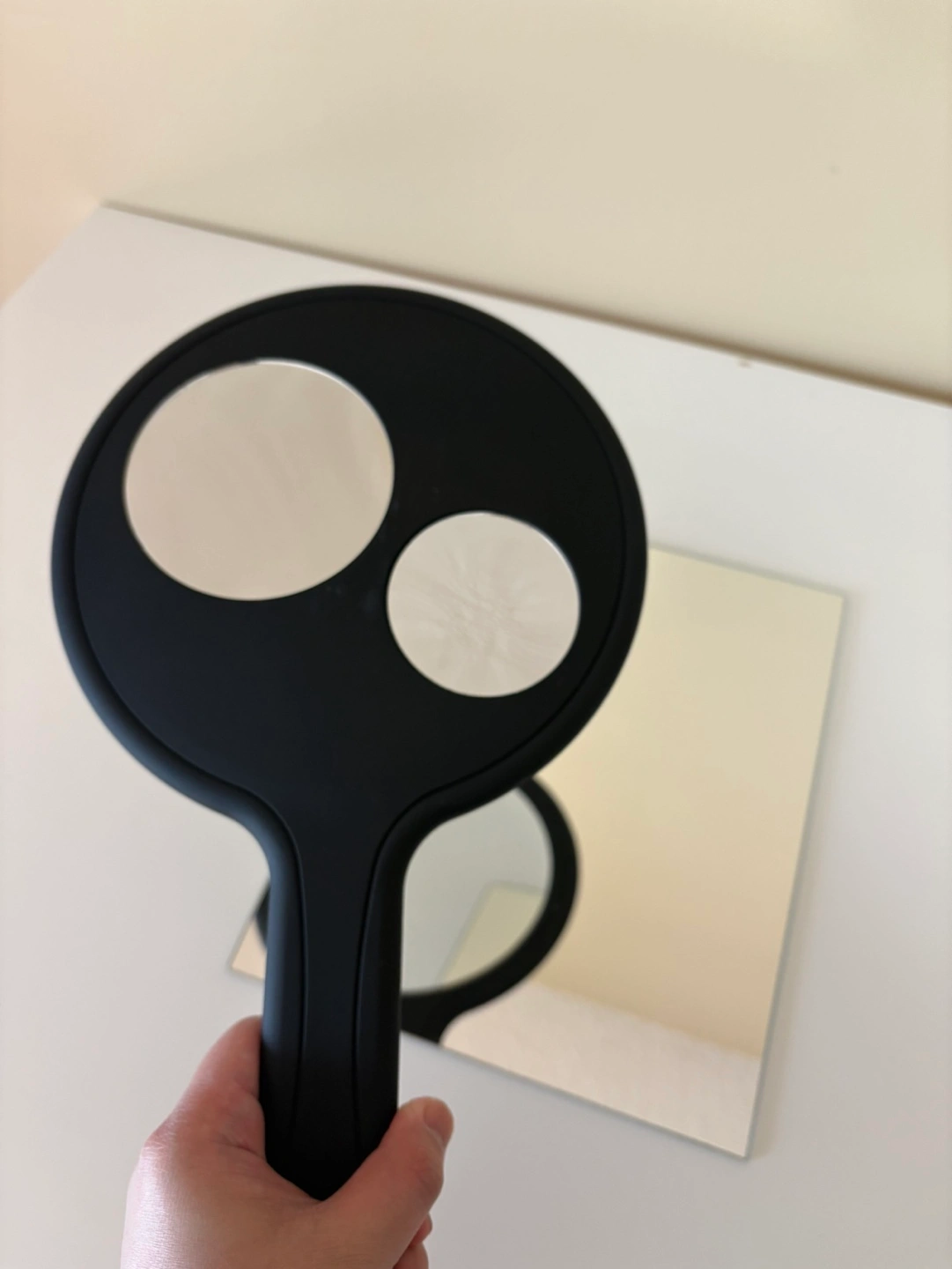 Black plastic handheld mirror. Two-sided design. One side features a large circular mirror and a smaller circular mirror. Includes a separate square mirror. Excellent for travel or everyday use.