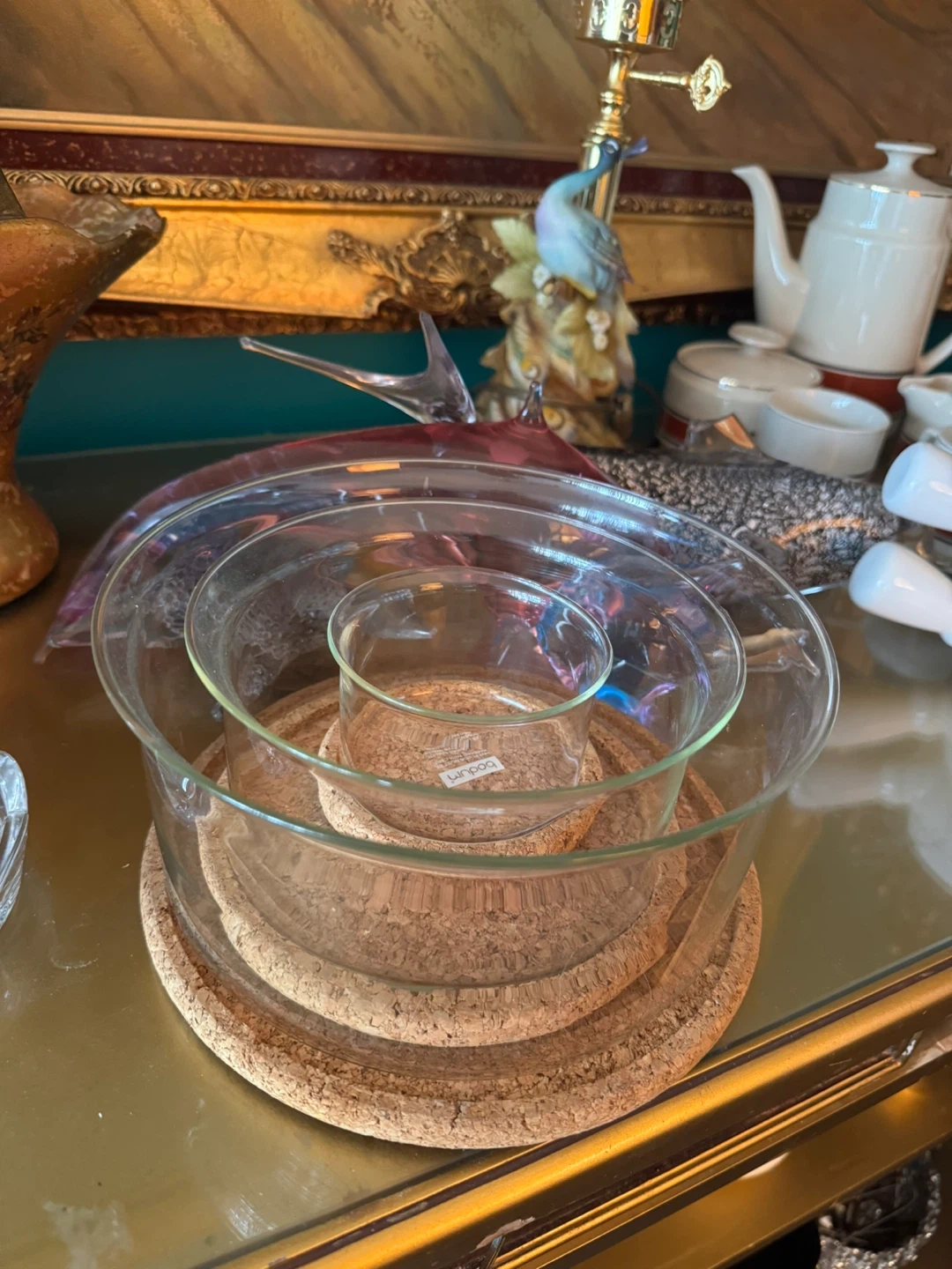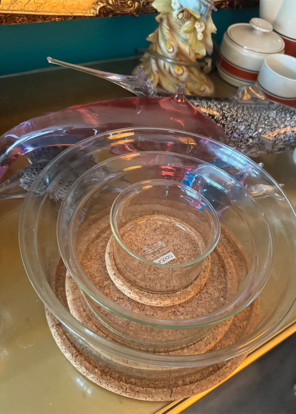 41Selling a set of Bodum glass bowls, each with its own cork coaster. They're in great condition and perfect for serving or mixing. The clear glass makes them versatile for any table setting!
