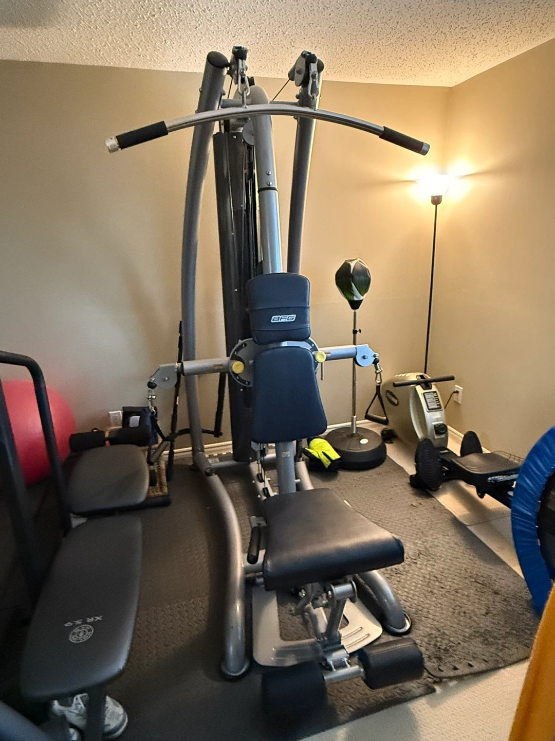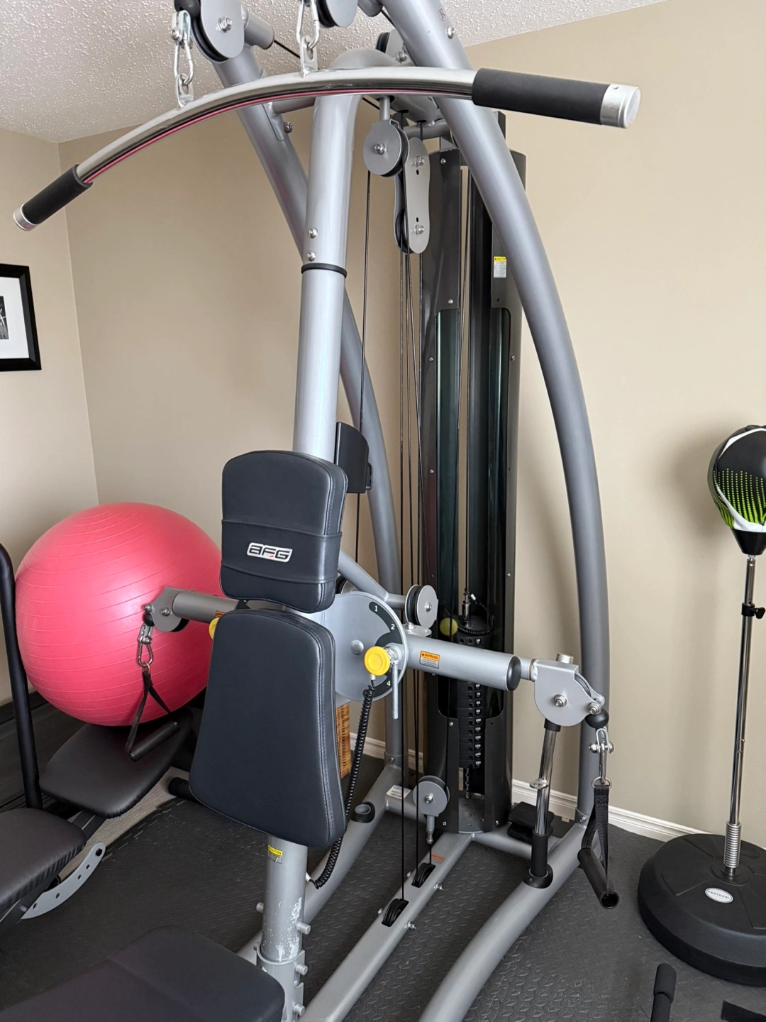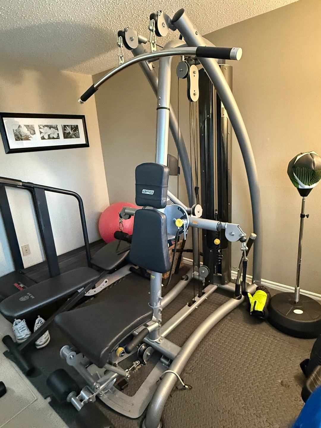AFG home gym. Excellent condition. Includes weight plates. Great for home workouts. Multiple workout stations.