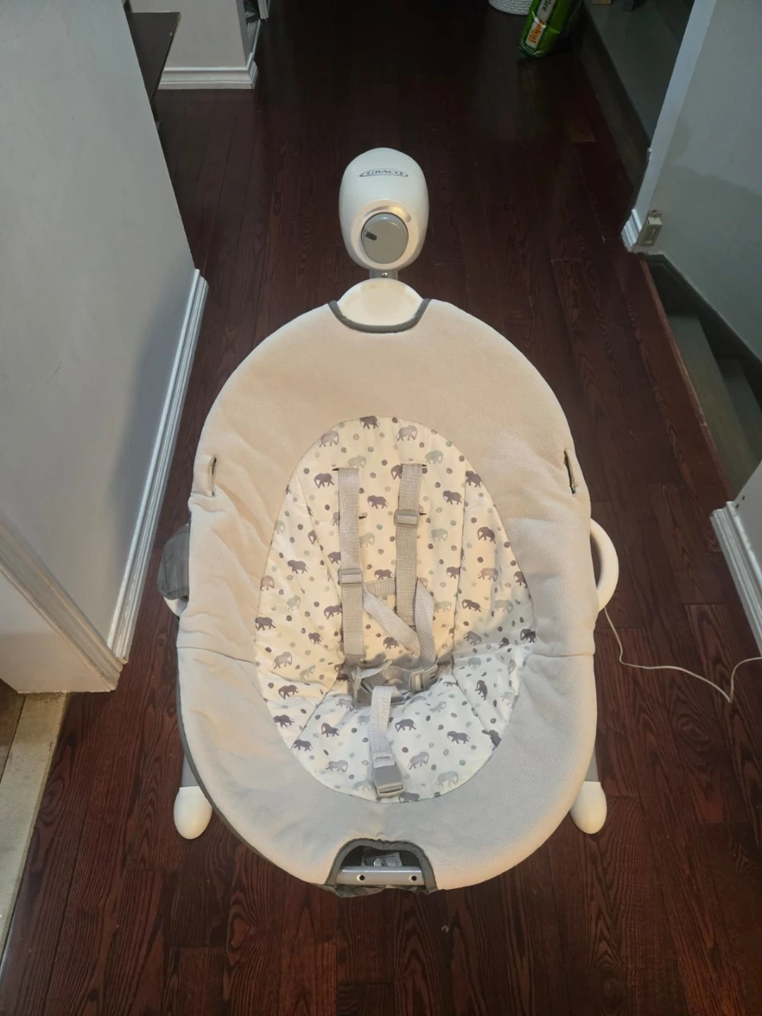 This is a Graco baby swing in a light grey colour with an elephant print seat. It's gently used and in good condition. Perfect for soothing a little one!