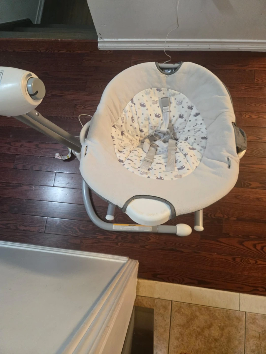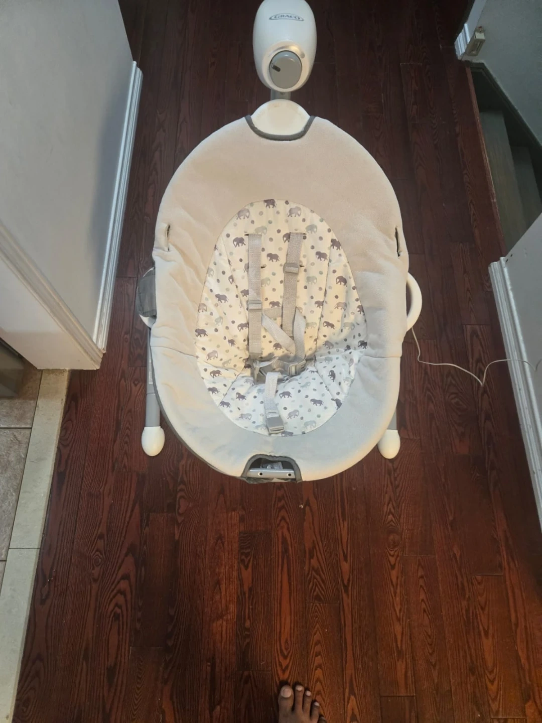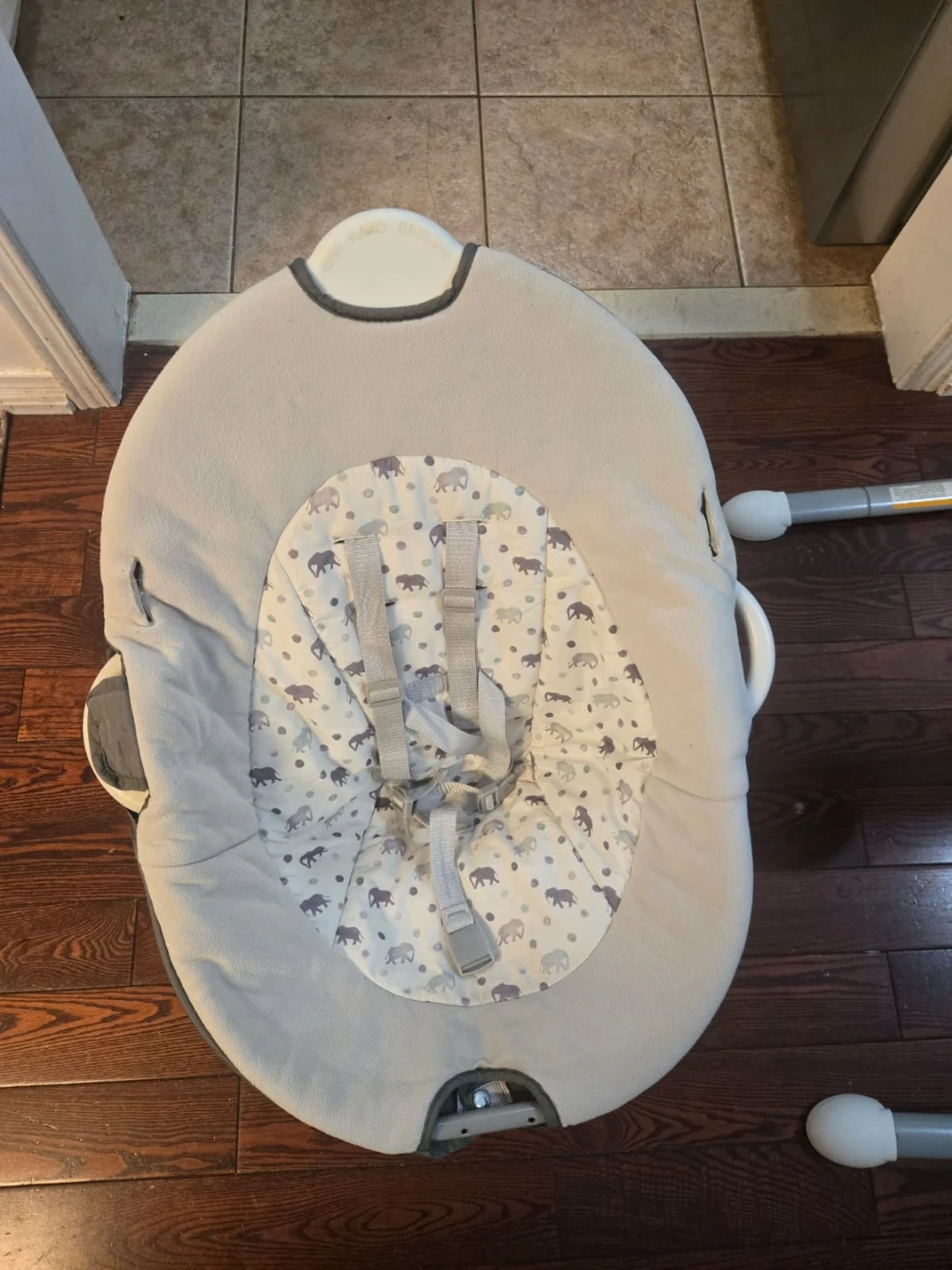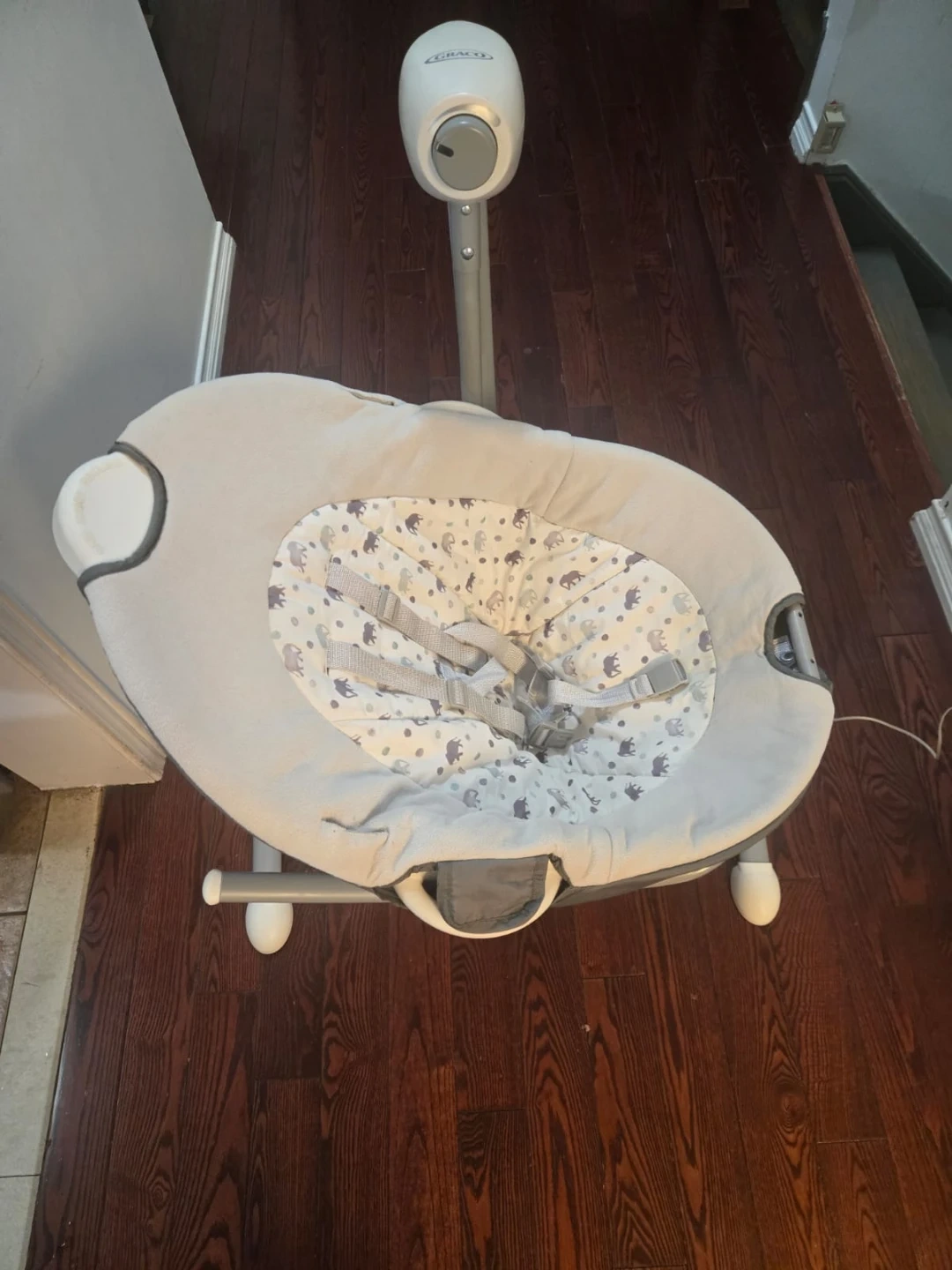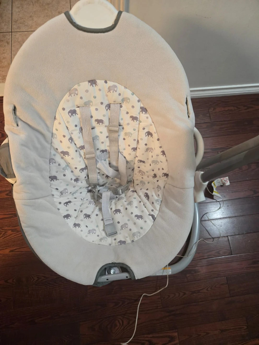 This is a Graco baby swing in a light grey colour with an elephant print seat. It's gently used and in good condition. Perfect for soothing a little one!