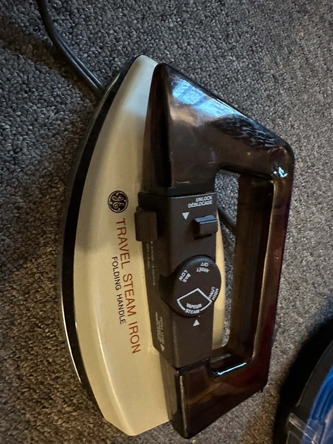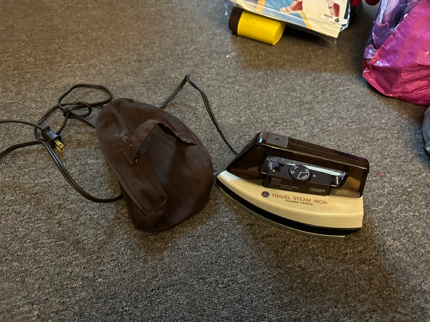 Vintage GE Travel Steam Iron with folding handle. Includes original carrying case. Zipper doesn’t work but iron works good