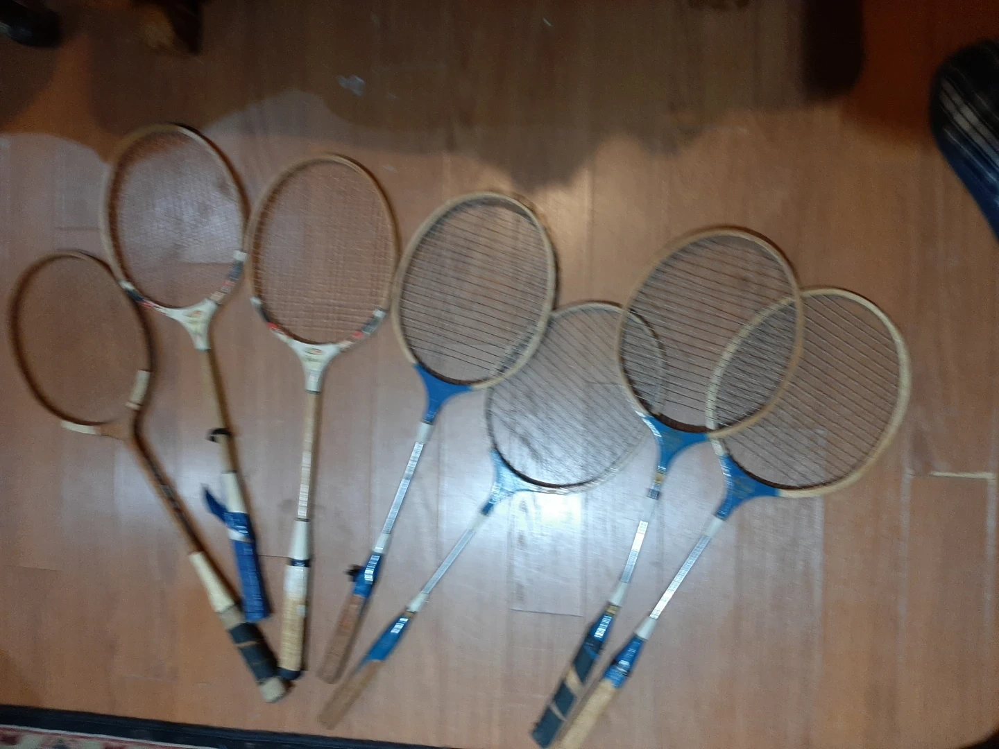 A collection of six wooden badminton rackets, perfect for recreational play. These rackets offer a classic feel for casual games. They're well-suited for beginners or those looking for a vintage aesthetic in their sports gear 🧡 BiNGO