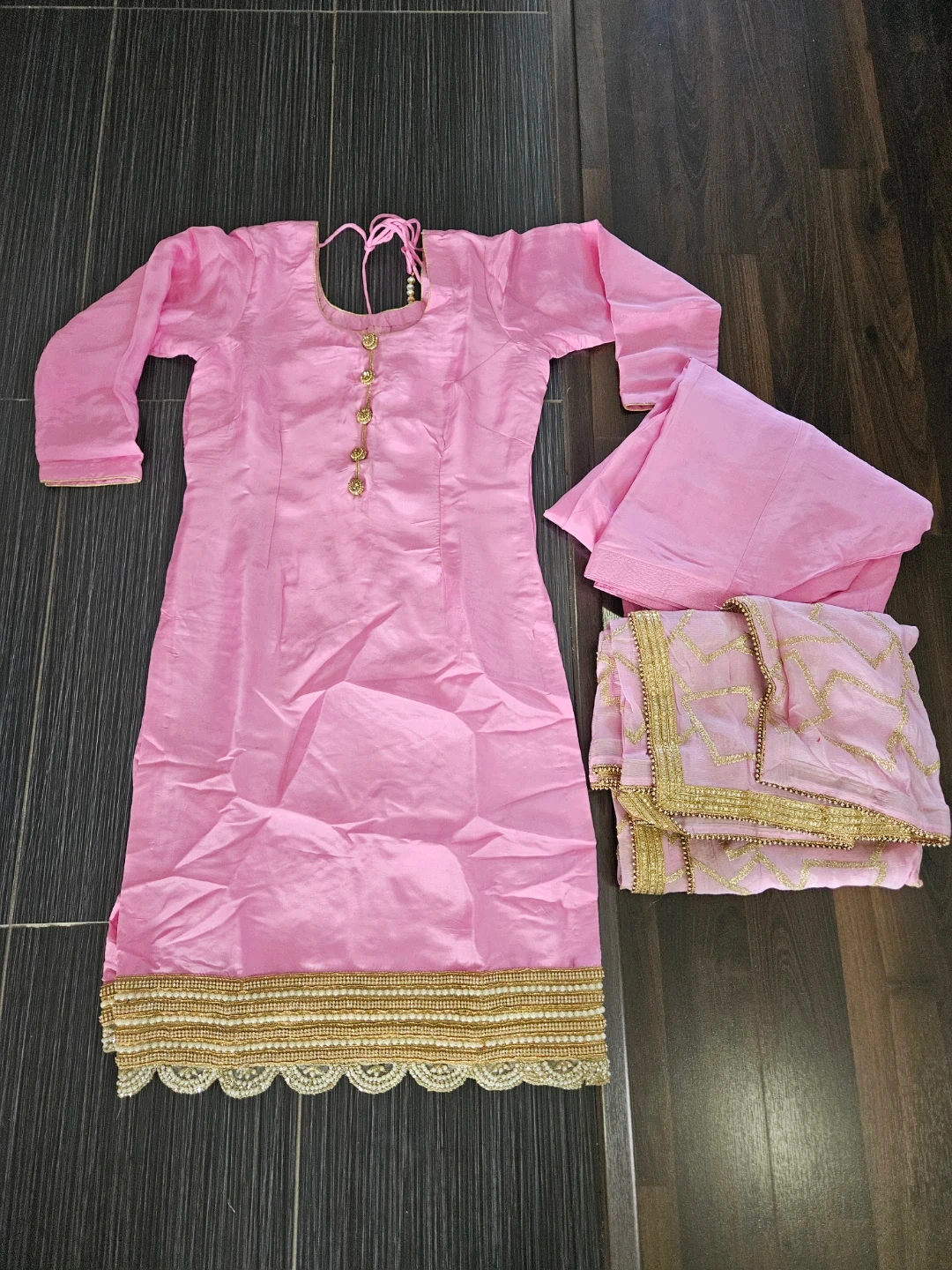 Selling a beautiful pink salwar kameez suit! The fabric is a lovely shade of pink, complemented by intricate gold detailing. Perfect for a special occasion or simply adding a touch of elegance to your wardrobe. It's in great condition and ready for a new home!
